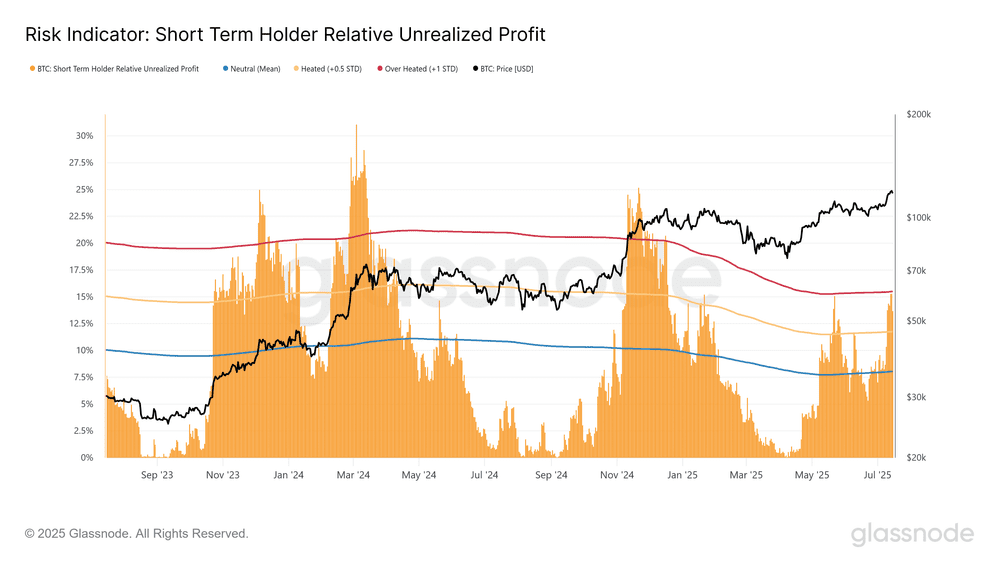برای ارزیابی بزرگی سود تحققنیافته یا سود نقدنشده هولدرهای جدید میتوانیم از دادههای شاخص سود تحققنیافته نسبی هولدرهای کوتاهمدت (Short-Term Holder Relative Unrealized Profit) استفاده کنیم. عدد این شاخص اخیراً به سطح ۱۵.۴٪ افزایش یافت (۱ انحراف معیار بالاتر میانگین) و سپس به ۱۳.۶٪ برگشت. این نشان میدهد که همزمان با پولبک قیمت بیت کوین، سود تحققنیافته هولدرهای کوتاهمدت نیز فروکش کرده است.