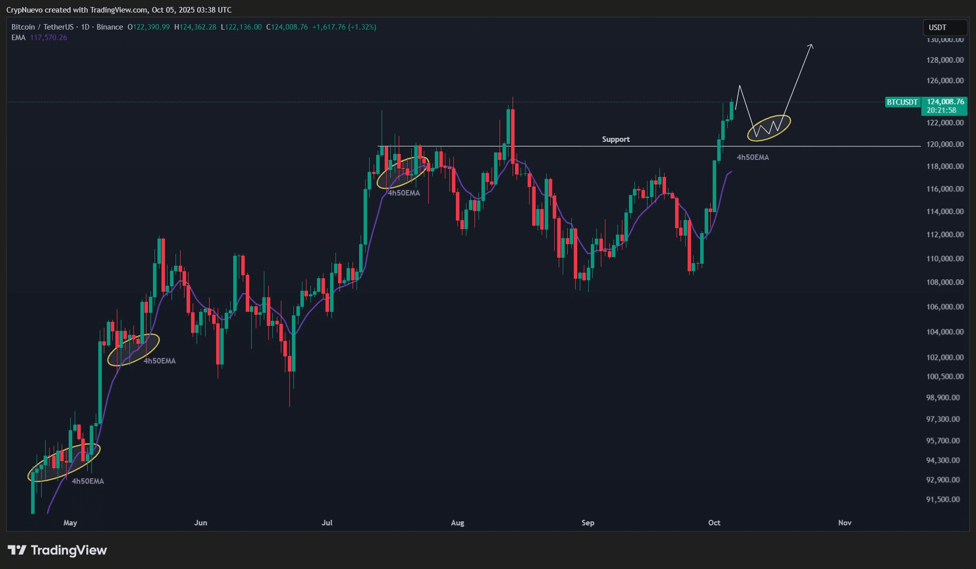 BTC باید ثابت کند که مقاومت ۱۲۴٬۰۰۰ دلاری در حال تضعیف است؛ و هر اصلاح یا افت جزئی از این سطح، می‌تواند همین موضوع را نشان دهد.