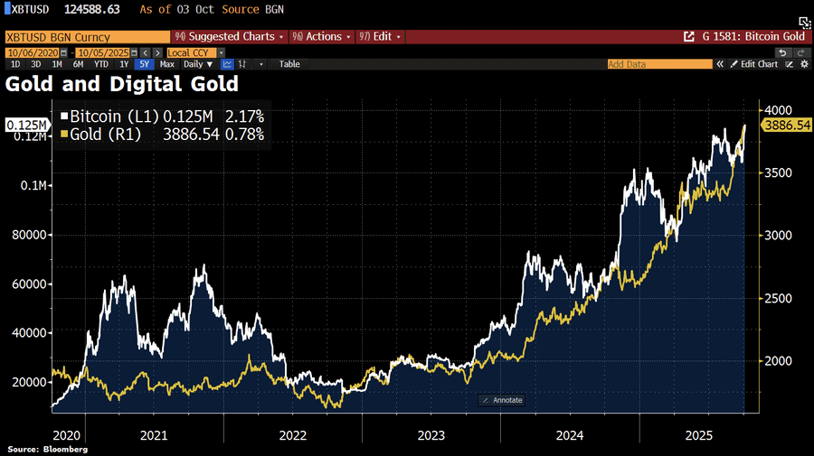 طلای دیجیتال، یعنی BTC، درست مانند همتای فیزیکی خود در حال رشد است و با عبور از ۱۲۵٬۰۰۰ دلار، رکورد جدیدی ثبت کرده است؛ نقطه‌عطفی در روندی که نشان می‌دهد سرمایه‌گذاران برای در امان ماندن از تورم و افت ارزش پول به دارایی‌های جایگزین پناه می‌برند.