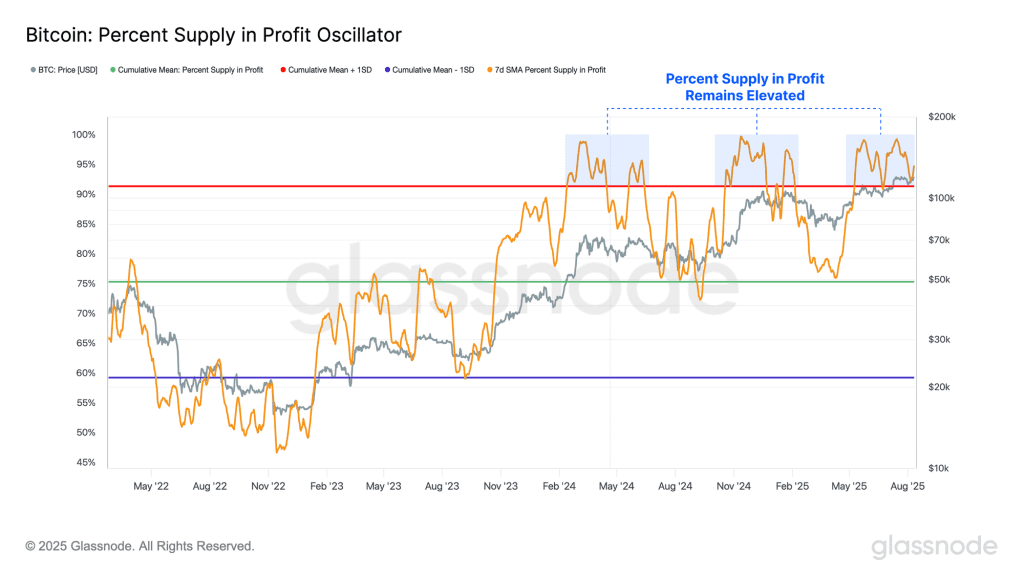 در رشد اخیر قیمت بیت کوین، عوامل فاندامنتالی مهمی نقش داشتند. درصد بخشی از عرضه در گردش بیت کوین که در سود است، در سطح انحراف معیار ۱+ حمایت شده و در دوره اصلاح قیمت، ثابت مانده است. در واقع ۹۵ درصد از هولدرهای بیت کوین با رشد مذکور همچنان در سود (تحقق‌نیافته) بودند.