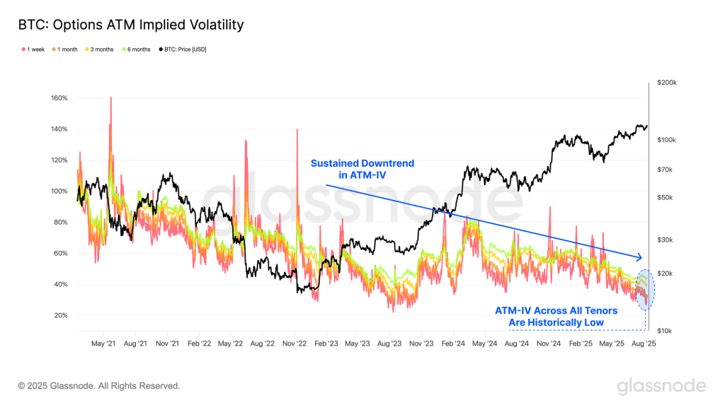 در بازار آپشن BTC، نوسانات ضمنی قیمت سربه‌سر (ATM IV) به‌طور پیوسته در حال کاهش بود. این نشان داد که معامله‌گران انتظار نوسانات شدید از قیمت BTC را ندارند. طبق تاریخچه BTC، معمولا پس از این شرایط تحرکات شدیدی در بازار دیده می‌شود و به همین دلیل می‌توان گفت که این شاخص با جهت بازار در تناقض بود.