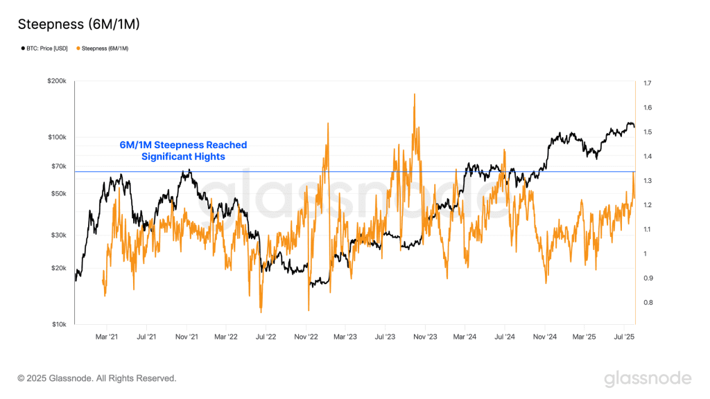 در حال حاضر شاخص نسبت نوسانات ضمنی ۶ماهه/۱ماهه با شیب بسیار تندی در حال رشد است. به‌طوری که تاکنون تنها در ۳.۲ درصد از کل روزهای معاملاتی بیت کوین عدد بالاتری برای این شاخص ثبت شده‌ است. این نشان می‌دهد که معامله‌گران بازار آپشن برخلاف چشم‌انداز کوتاه‌مدت، درباره وضعیت بلندمدت بازار به‌شدت نامطمئن بودند و انتظارات آن‌ها از نوسانات شدید در دو فصل آینده بسیار زیاد بود.
