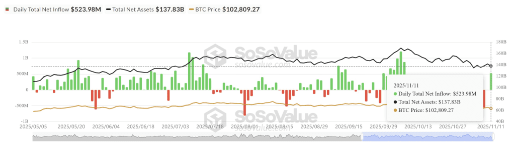 علی‌رغم مشکلات فعلی، نوسانات ممکن است به زودی به نفع BTC تغییر کند. با توجه به اینکه صندوق‌های قابل معامله در بورس (ETF) بیت کوین اسپات نشانه‌هایی از بهبود را از خود نشان می‌دهند. این امر به معنی بازگشت تدریجی تقاضای آن‌ها پس از سقوط بی‌سابقه بازار کریپتو در اوایل اکتبر است. ETF‌های بیت کوین اسپات در روز سه‌شنبه، ۵۲۴ میلیون دلار ورودی خالص داشتند که بزرگترین رقم یک‌روزه از ۷ اکتبر بود.