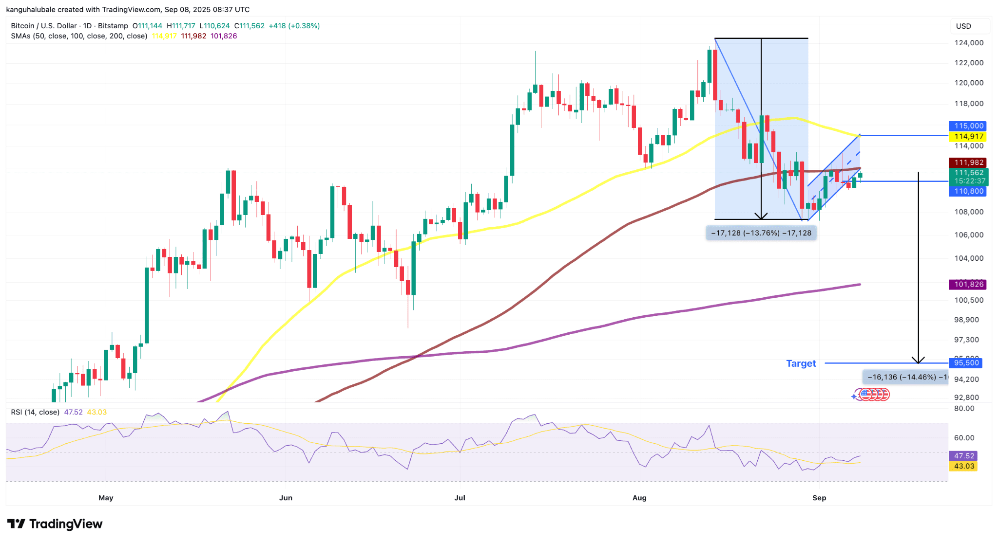 از نظر تکنیکال نیز BTC الگوی پرچم نزولی تشکیل داده‌ است. قیمت پس از ثبت رکورد ۱۲۴,۵۰۰ دلار در ۱۶ آگوست (۲۵ مرداد)، حدود ۱۴ درصد سقوط کرد و در ۳۰ آگوست (۲۹ مرداد) به کف هفت‌هفته‌ای ۱۰۷,۵۰۰ دلار رسید. سپس اندکی بازیابی شد و اکنون در محدوده ۱۱۱,۵۰۰ دلار قرار دارد.