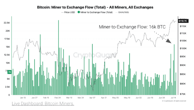 به گزارش بی‌این‌کریپتو، در تاریخ ۱۵ جولای (۲۴ تیر)، ماینرها بیش از ۱۶٬۰۰۰ بیت کوین به صرافی‌ها منتقل کردند. این بیشترین مقدار فروش روزانه از ۷ آوریل (۱۸ فروردین)  تا کنون بود که در آن زمان ۱۷٬۰۰۰ بیت کوین منتقل شده بود.