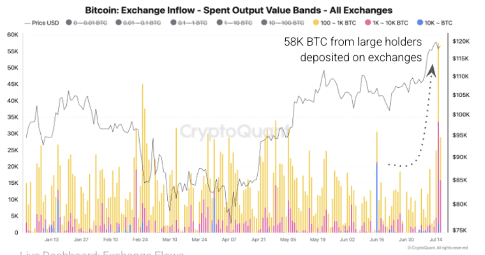 اما فشار فروش فقط محدود به ماینرها نبود. گروه‌های دیگر نیز تصمیم گرفتند در اوج قیمت بازار، سود خود را نقد کنند. ورودی کل BTC به صرافی‌ها در آن روز به ۸۱٬۰۰۰ واحد رسید، در حالیکه چند روز قبل فقط ۱۹٬۰۰۰ BTC منتقل شده‌ بود. نهنگ‌ها نقش بزرگی در این افزایش داشتند و میزان انتقال آن‌ها از ۱۳٬۰۰۰ به ۵۸٬۰۰۰ بیت کوین رسید.
