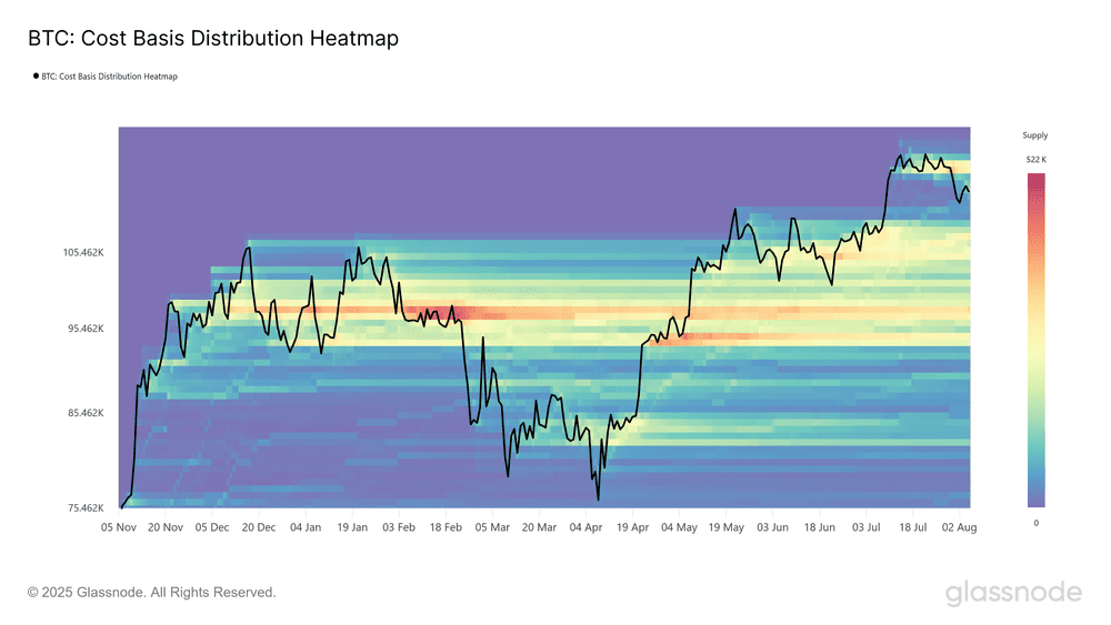 به گزارش گلسنود، BTC پس از آنکه به رکورد تاریخی ۱۲۳٬۰۰۰ دلار رسید، وارد فاز اصلاح شد و قیمت آن تا ۱۱۳٬۰۰۰ دلار کاهش یافت. اصلاح قیمت بیت کوین باعث شد که بسیاری از خریداران جدید وارد ضرر شوند. در واقع در بالای سطح ۱۱۶٬۰۰۰ دلار خرید زیادی صورت گرفت و یک تراکم بزرگ عرضه در این محدوده تشکیل شد.