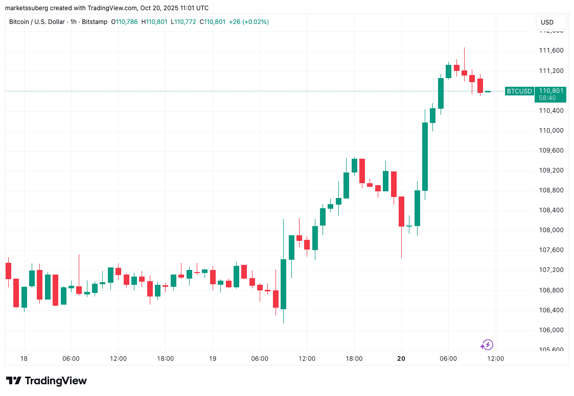 قیمت بیت‌کوین در روز یکشنبه تا ۱۰۸,۶۰۰ دلار رسید و بعد کمی پایین آمد، اما در جلسه معاملاتی آسیایی دوباره به ۱۱۱٬۰۰۰ دلار جهش کرد.