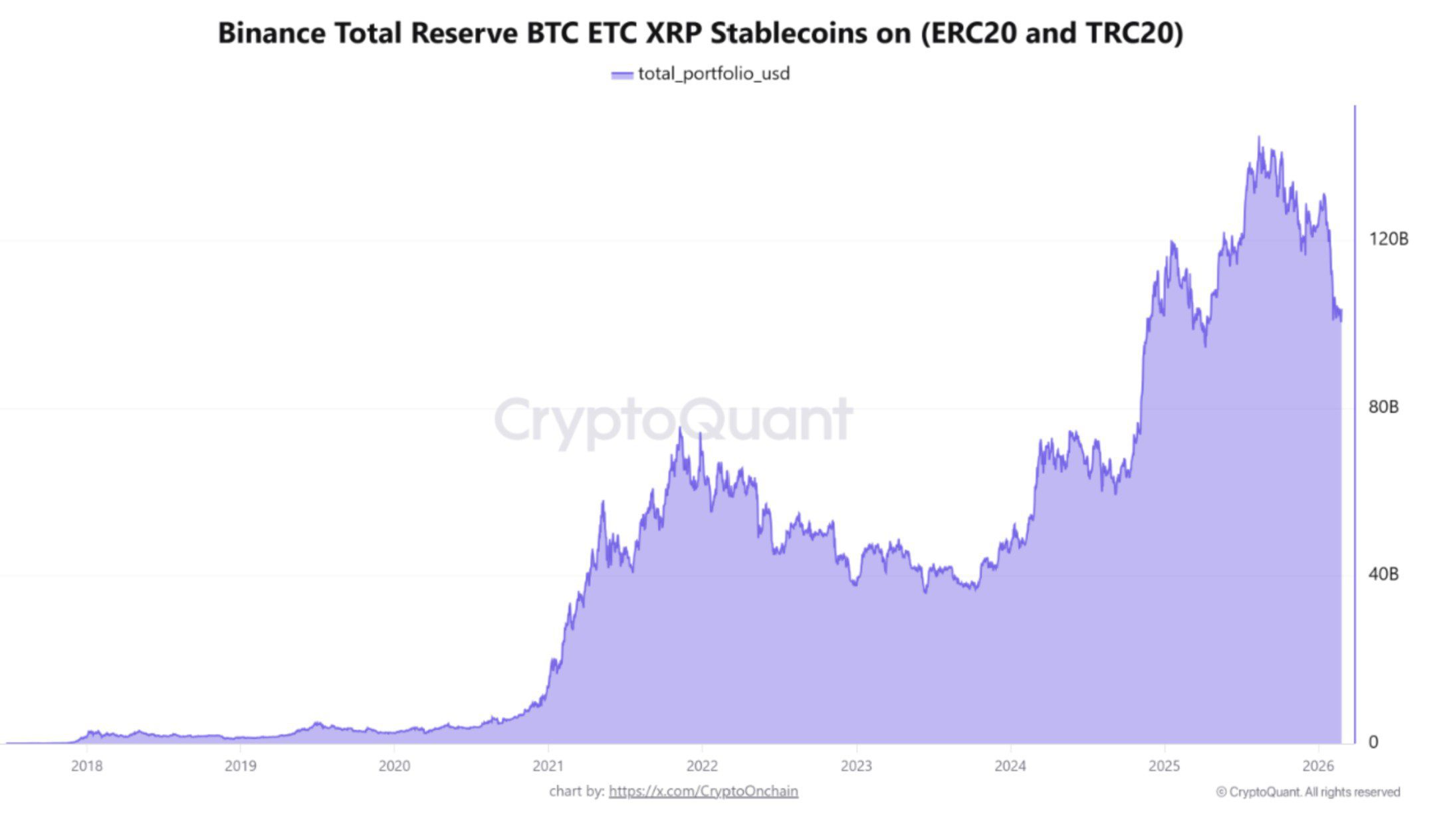 در همین حال، داده‌های کریپتوکوانت نشان می‌دهد که ارزش کل پرتفوی بایننس در بیت کوین، اتریوم، ریپل و استیبل کوین‌های اصلی ERC20 و TRC20 به حدود ۱۰۲ میلیارد دلار کاهش یافته است. این پایین‌ترین میزان از آوریل ۲۰۲۵ (فروردین ۱۴۰۴) است که از حدود ۱۴۰ میلیارد دلار در آگوست ۲۰۲۵ (مرداد ۱۴۰۴) کمتر است.