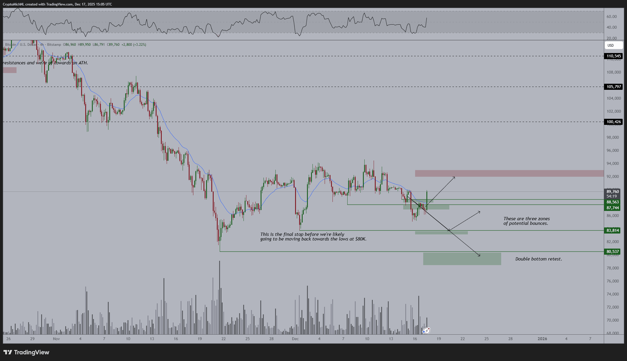 البته بعضی از تحلیلگران همچنان نزولی هستند. آنها با برگشت بیت کوین بعد از برخورد به ۹۰٬۰۰۰ دلار، حمایت ۷۶٬۰۰۰ دلار را تحت نظر دارند. تحلیلگری به اسم Roman گفته است: