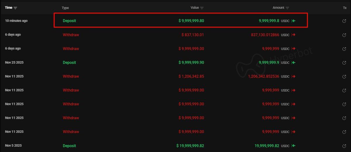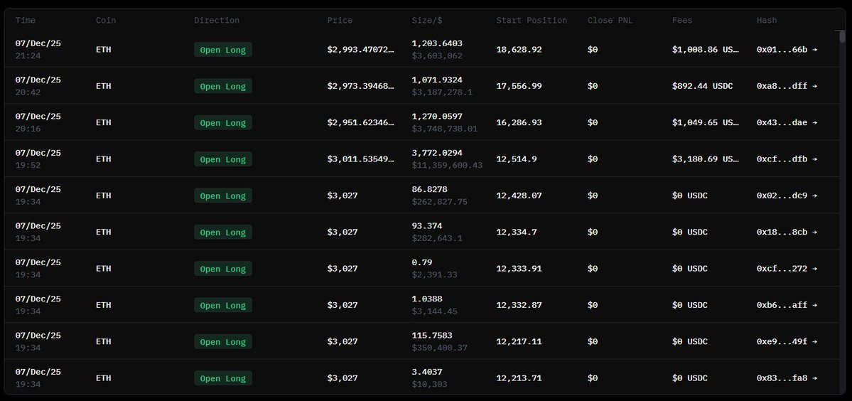 یک سرمایه‌گذار قدیمی و مشهور بیت‌کوین که در جامعه کریپتو با عنوان Bitcoin OG (10/11) شناخته می‌شود، اخیراً حدود ۱۰ میلیون دلار USDC را به پلتفرم Hyperliquid منتقل کرده و یک پوزیشن لانگ اهرم‌دار ۵ برابری روی ۹,۰۱۰.۴ واحد اتریوم باز کرده است.