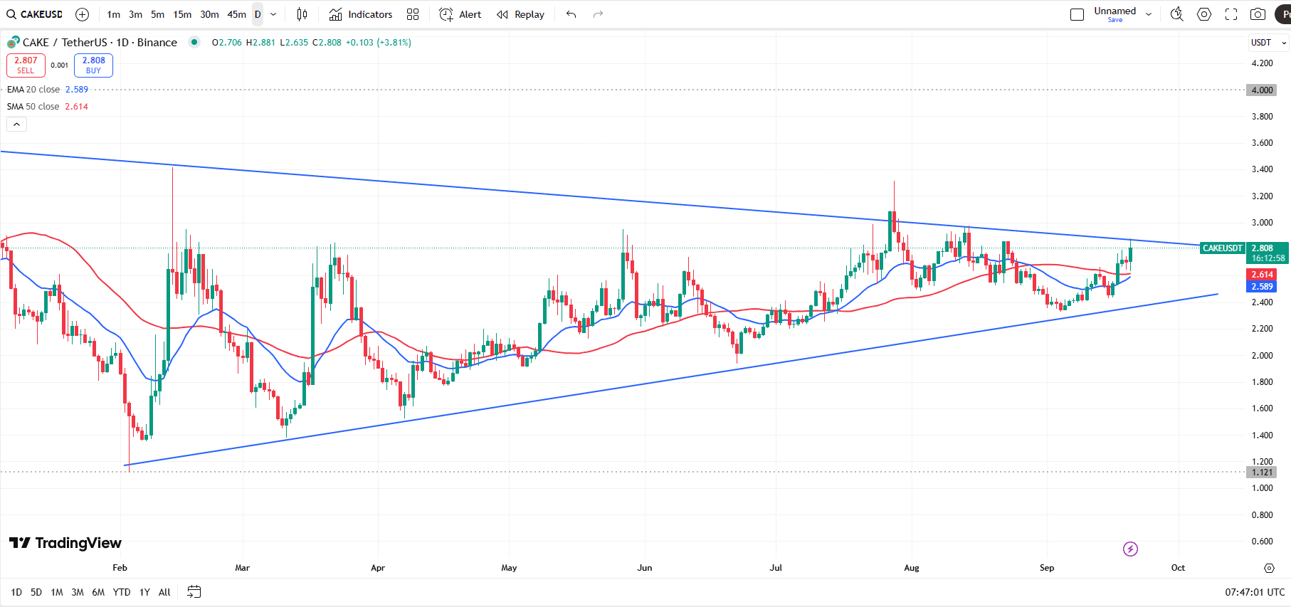 طبق دادههای تریدینگویو، قیمت پنکیک سواپ در یک الگوی مثلث متقارن قرار گرفته است. کفهای بالاتر از ابتدای سال و سقفهای پایینتر، محدودهای فشرده ایجاد کردهاند که اکنون قیمت در نزدیکی ضلع بالایی این الگو قرار دارد.