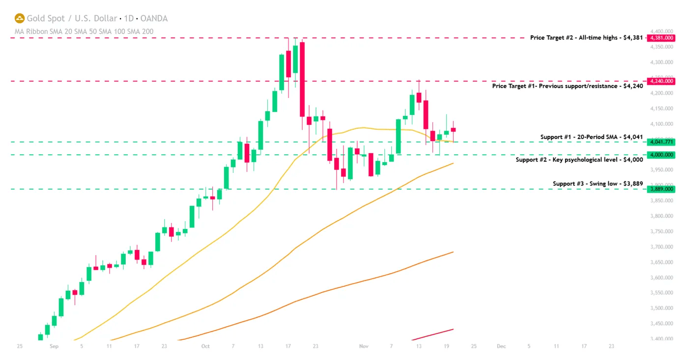 از نظر تکنیکال، طلا پس از رسیدن به هدف ۴٬۰۹۰ دلار اکنون درگیر مقاومتهای مهم ۴٬۲۴۰ و ۴٬۳۸۱ دلار است. سطح روانی ۴٬۰۰۰ دلار و میانگینهای متحرک نیز حمایتهای کلیدی محسوب میشوند. با وجود موضع سختگیرانه فدرال رزرو، الگوهای کندلی اخیر نشان میدهد تقاضای خرید همچنان فعال است.