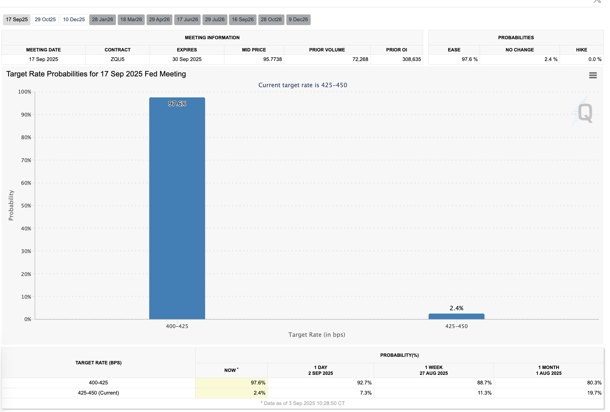 به گزارش افاکس استریت، ابزار FedWatchTool که بر پایه قراردادهای آتی فدرال رزرو کار میکند، نشان میدهد که احتمال کاهش ۲۵ واحد پایه در نشست ۱۷ سپتامبر (۲۶ شهریور) به ۹۷.۶ درصد رسیده است. ماه گذشته شاخص قیمت تولیدکننده آمریکا ۰.۹ درصد رشد کرد که ناشی از تأثیر تعرفههای تجاری ترامپ بر واردات بود.