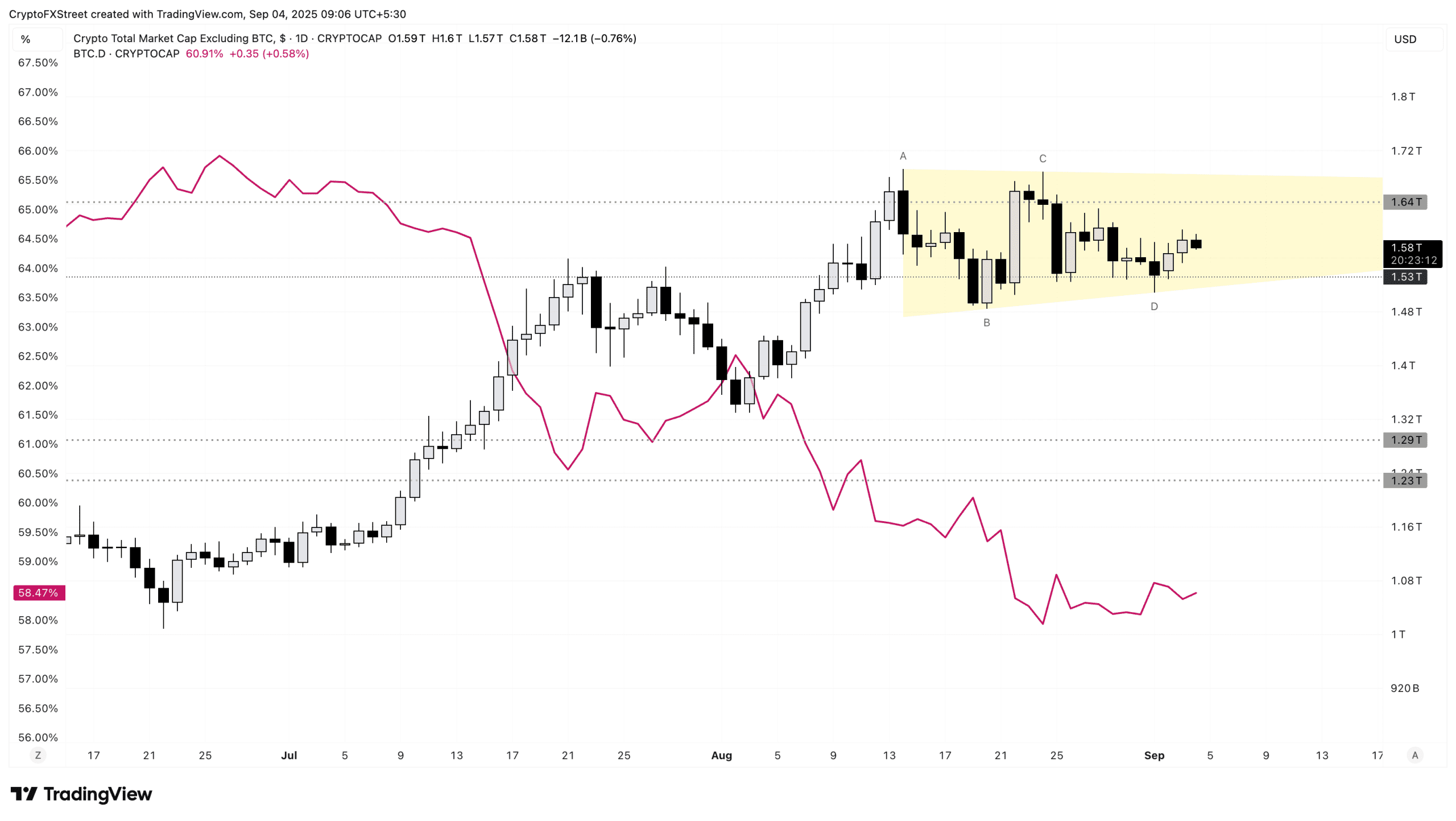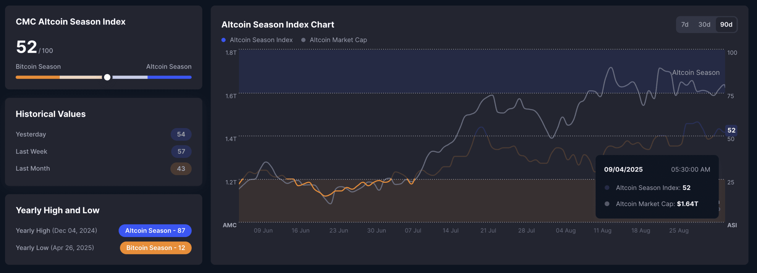 بازار آلت کوینها توانسته سطح ۱.۵۰ تریلیون دلار را حفظ کند، در حالی که بیت کوین بخشی از قدرت خود را در بازار از دست داده است. انتظار کاهش نرخ بهره توسط فدرال رزرو آمریکا همراه با جابهجایی سرمایه در بازار کریپتو، احتمال شروع آلت سیزن را افزایش داده است. با این حال، کاهش ناگهانی علاقه سرمایهگذاران نهادی به BTC و احساسات متناقض بازار میتواند این روند را به تأخیر بیندازد.