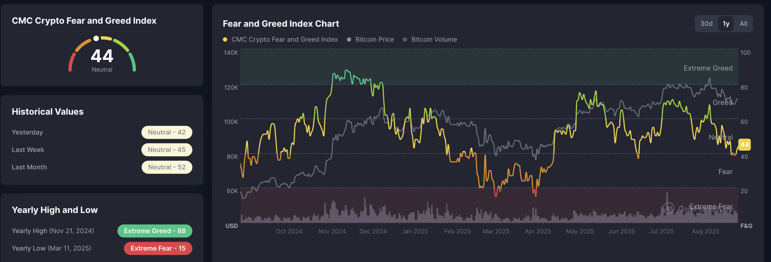 از سوی دیگر، شاخص ترس و طمع در سطح ۴۴ است که نشاندهنده شرایط خنثی و بازگشت نوسان به بازار است. معمولاً برای ورود سرمایهگذاران به آلت کوینها نیاز به هیجان بالاتری در بازار است.