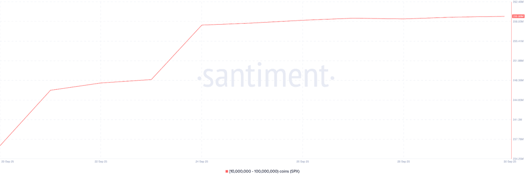 طبق داده‌های، آدرس‌هایی که بین ۱۰ میلیون تا ۱۰۰ میلیون توکن SPX دارند، تنها در ۱۰ روز گذشته ۲۳.۰۴ میلیون توکن خریداری کرده‌اند. این امر نشان‌دهنده افزایش اعتماد این گروه از سرمایه‌گذاران است.