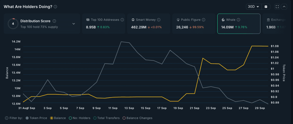همچنین در همین بازه، ۱۰۰ نهنگ برتر بازار کریپتو نیز موقعیت‌های ONDO خود را ۱ درصد افزایش دادند که امیدواری برای ماه اکتبر (مهر) را بیشتر کرده است. افزایش فعالیت نهنگ‌ها در این توکن نشانه‌ای از اعتماد نهادی رو به رشد است و حاکی از آن است که نهنگ‌ها زودتر از موعد در حال آماده‌سازی برای صعود احتمالی هستند. اگر روند انباشت ادامه پیدا کند، قیمت اوندو می‌تواند به بالای ۰.۸۹۵۵ دلار برسد.