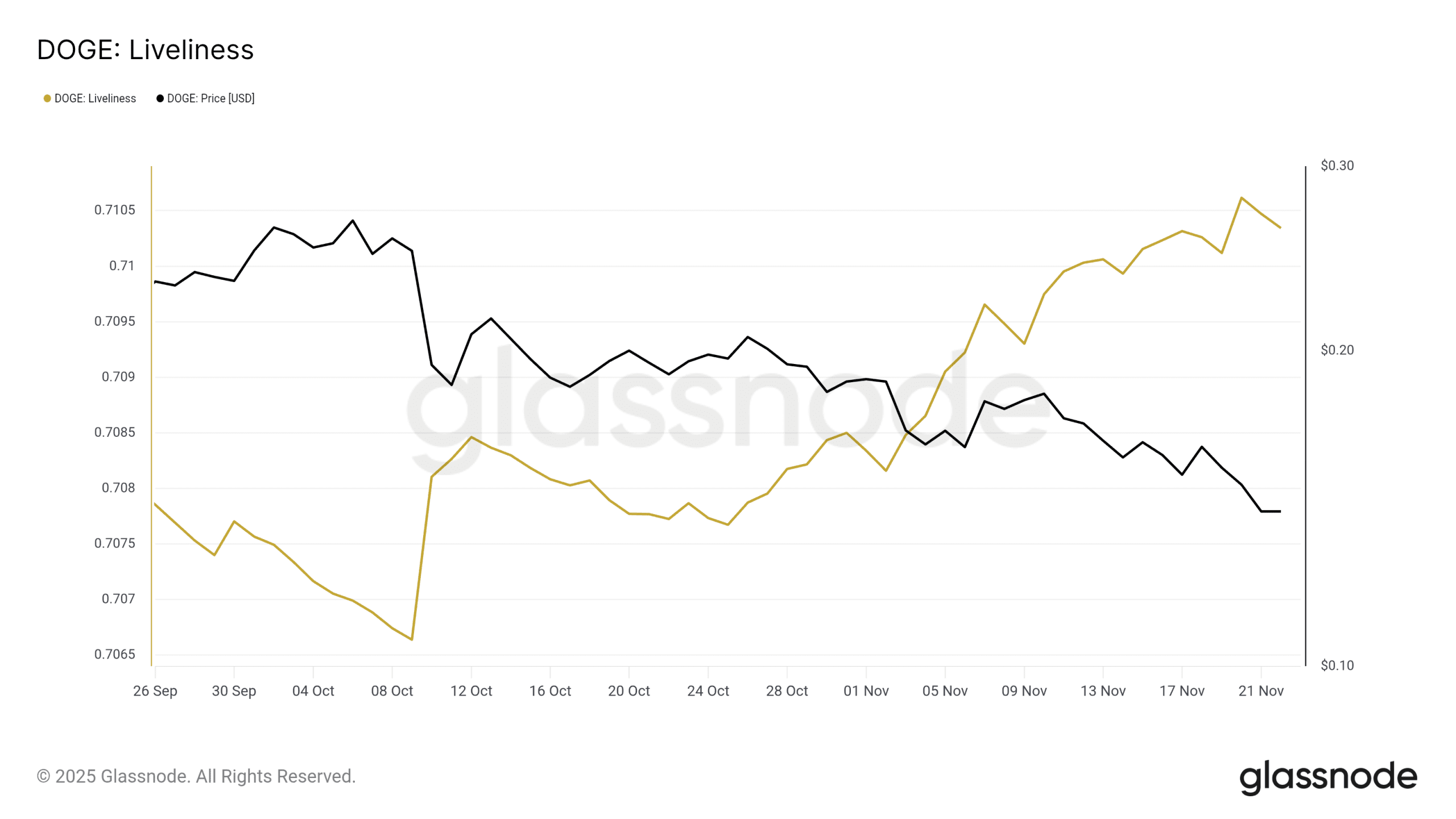 شاخص‌های ماکرو نیز تصویر امیدوارکننده‌ای نشان می‌دهند. شاخص Liveliness دوج کوین چند روزی است در حال افزایش است که یعنی هولدرهای بلندمدت بیشتر در حال نگه‌داری هستند و کمتر می‌فروشند.