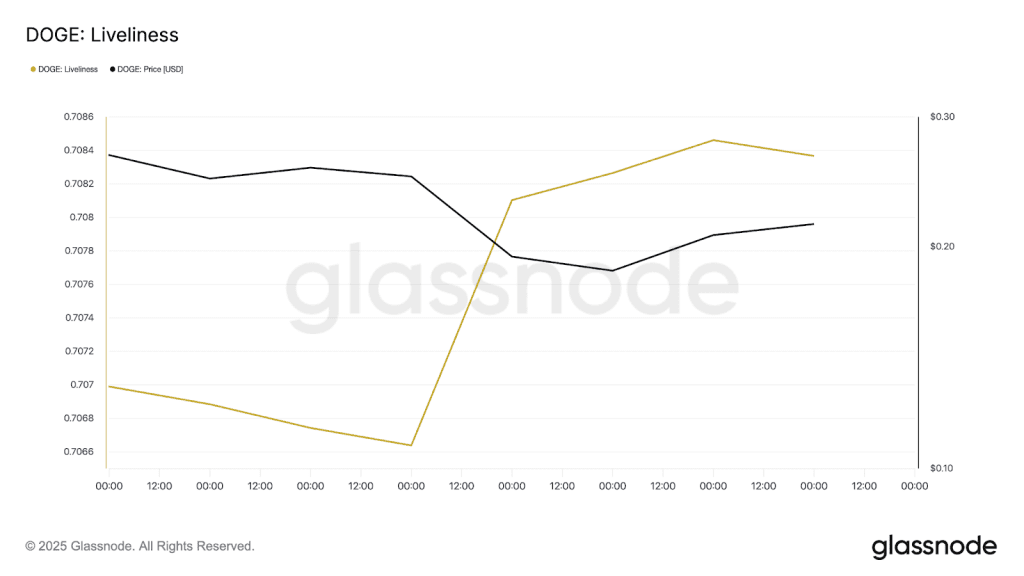 در چند روز اخیر، شاخص Liveliness دوج کوین به‌طور پیوسته در حال افزایش بوده است. این شاخص نشان می‌دهد که هولدرهای بلندمدت (LTHs) در حال جابجایی یا فروش دارایی‌های خود هستند. طبق داده‌ها، مقدار این شاخص در ۱۳ اکتبر (۲۱ مهر) به ۰.۷۰۸ رسیده است.