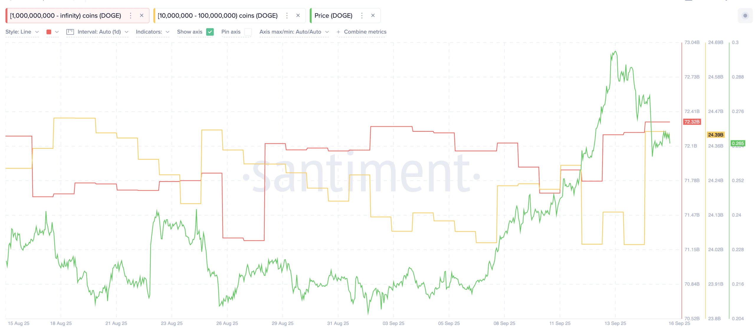 در همین زمان نهنگها نیز فعال بودهاند. هولدرهای بیش از ۱ میلیارد DOGE بین ۱۳ تا ۱۵ سپتامبر (۲۲ تا ۲۴ شهریور) حدود ۵۴۰ میلیون توکن (معادل ۱۴۰ میلیون دلار) به دارایی خود اضافه کردند.