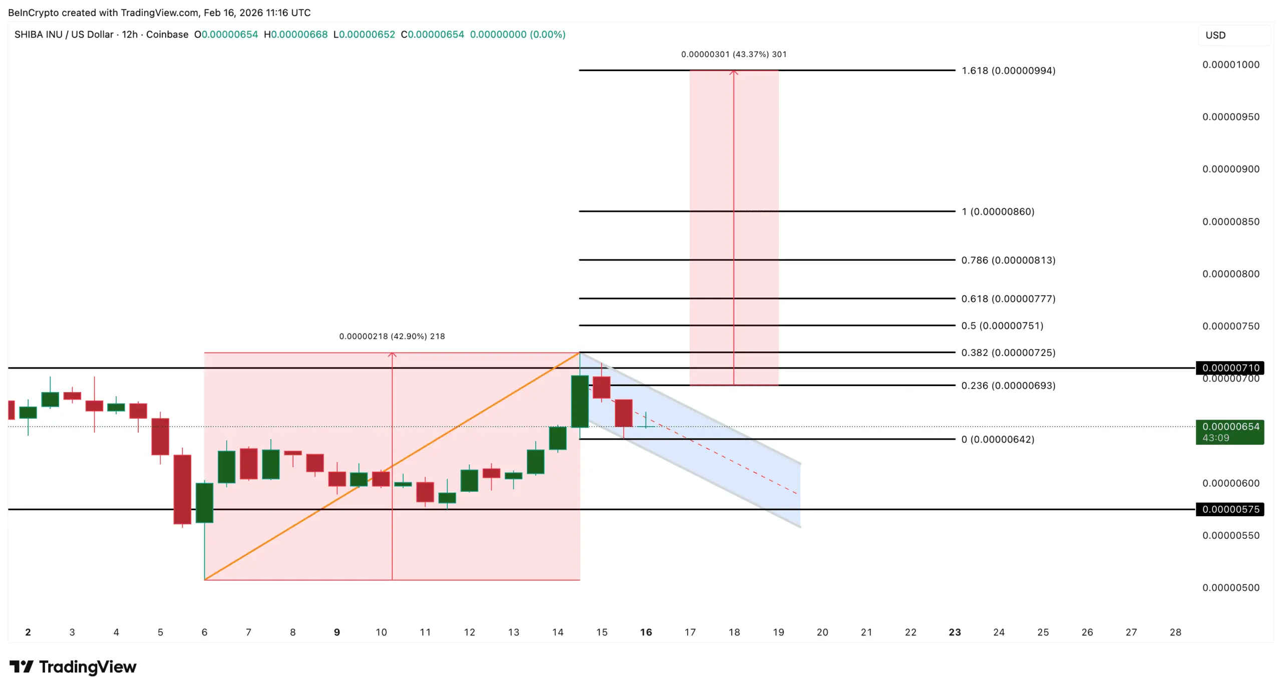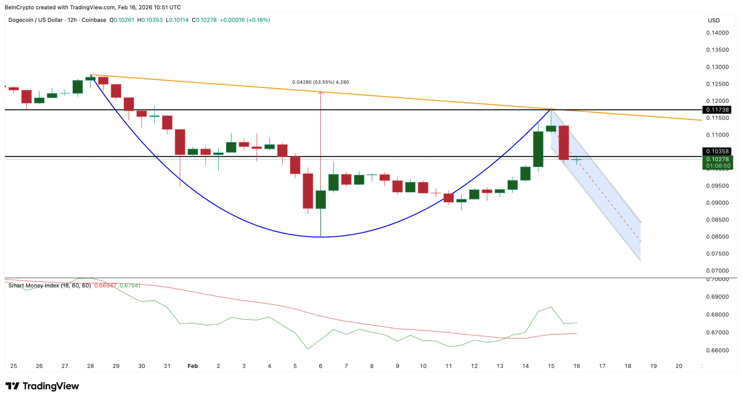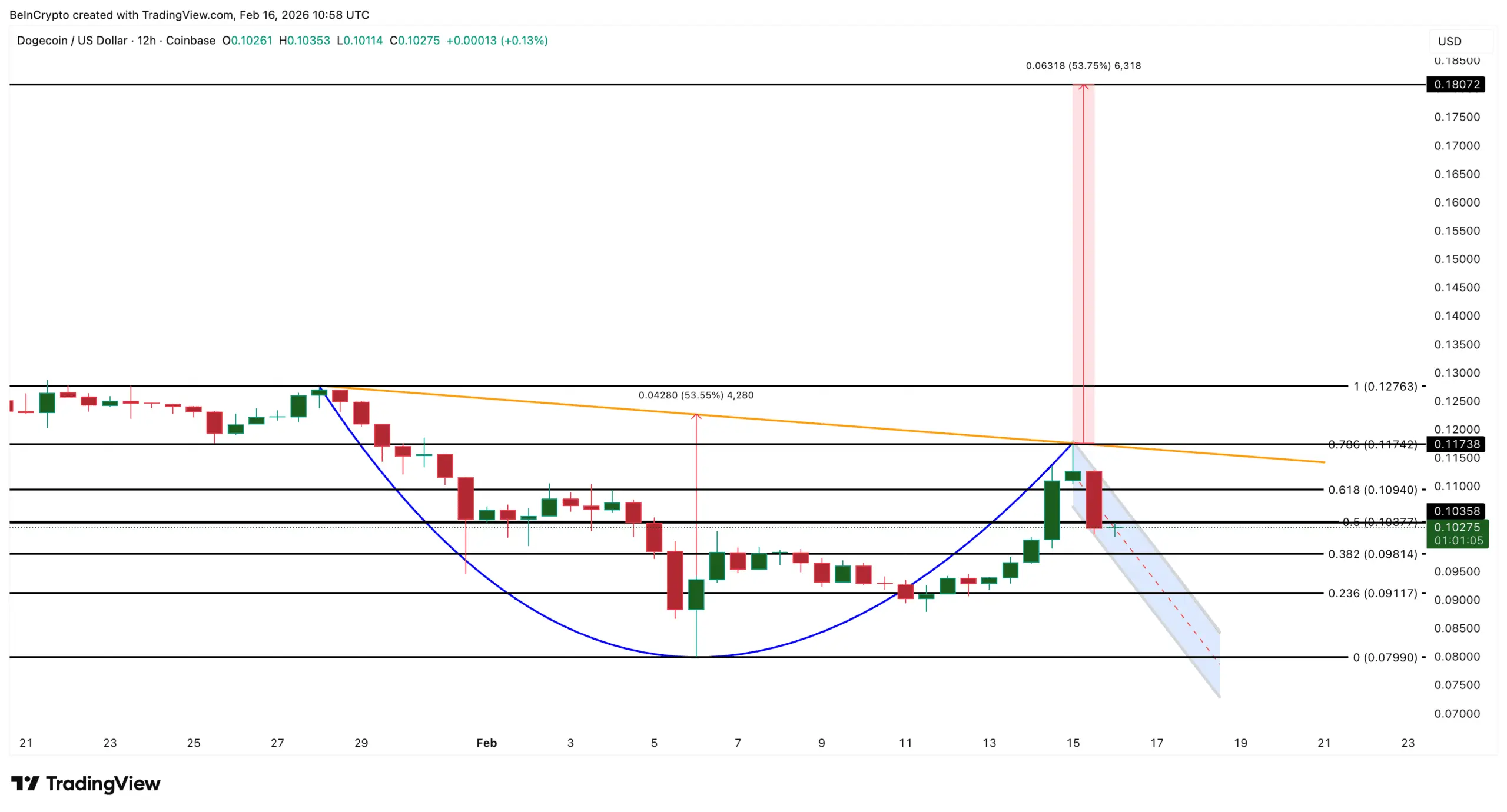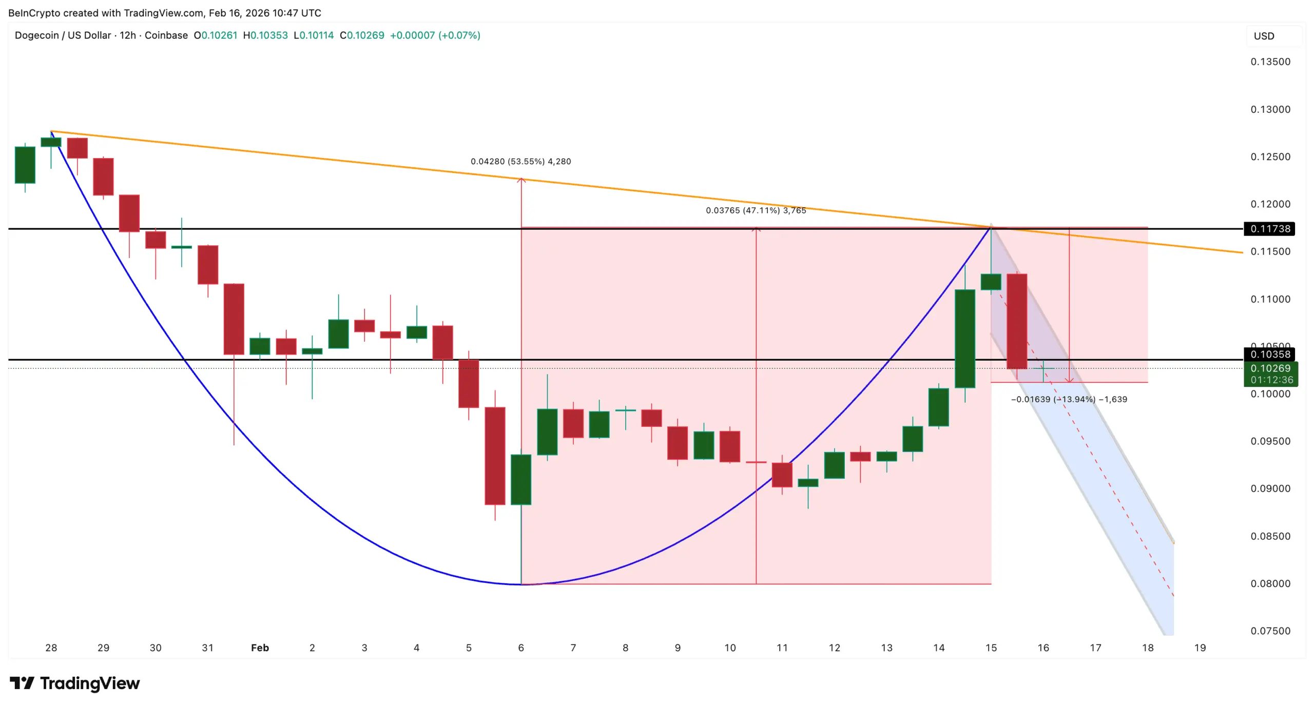 با وجود عقب‌نشینی ۱۳ درصدی اخیر، ساختار قیمت دوج‌کوین همچنان صعودی است. در نمودار ۱۲ ساعته، دوج‌کوین در حال تشکیل الگوی فنجان و دسته است. این الگو اغلب قبل از ادامه رالی‌ها ظاهر می‌شود.