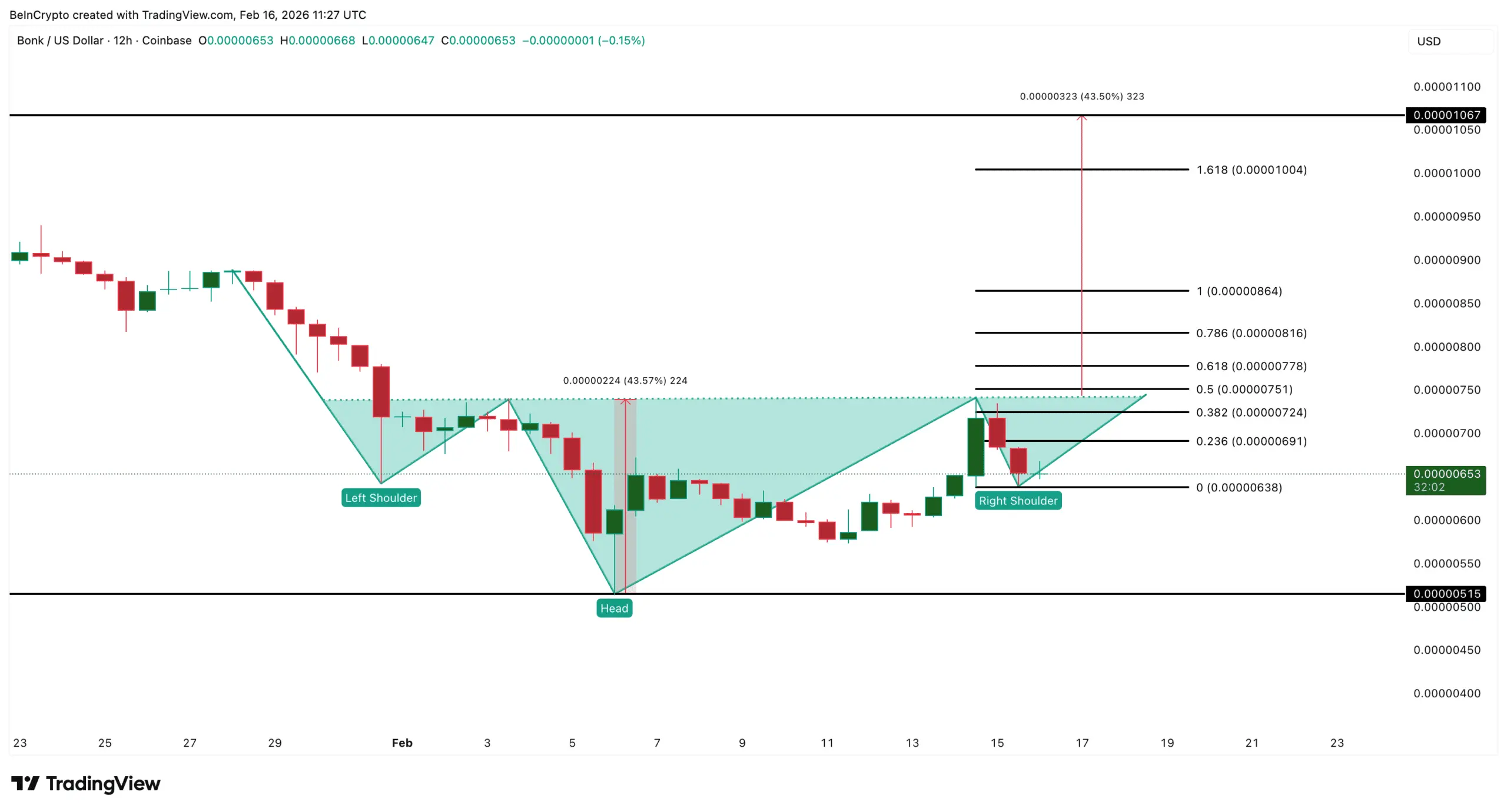 بونک در حال تشکیل الگوی سر و شانه معکوس در نمودار ۱۲ ساعته است. این الگو زمانی شکل می‌گیرد که فروشندگان قدرت خود را از دست می‌دهند و خریداران به تدریج کنترل را به دست می‌گیرند. سطح شکست در حدود ۰.۰۰۰۰۰۷۵ دلار قرار دارد. اگر بونک از این سطح بالاتر رود، الگو حرکت به سمت ۰.۰۰۰۰۱۰ دلار را پیش‌بینی می‌کند که حدود ۴۳ درصد رشد از خط گردن خواهد بود.
