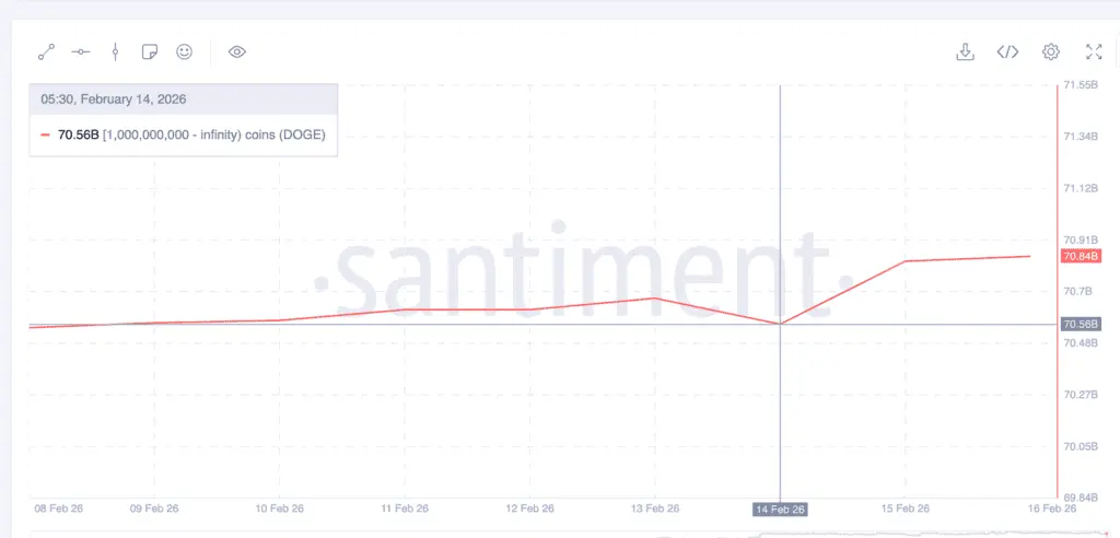 نهنگ‌ها نیز انباشت کردند. کیف پول‌هایی که بیش از یک میلیارد دوج کوین (بزرگ‌ترین نهنگ‌ها) نگهداری می‌کنند، دارایی‌های خود را از ۷۰.۵۶ میلیارد به ۷۰.۸۴ میلیارد کوین افزایش دادند و تقریباً ۲۸۰ میلیون کوین اضافه کردند.