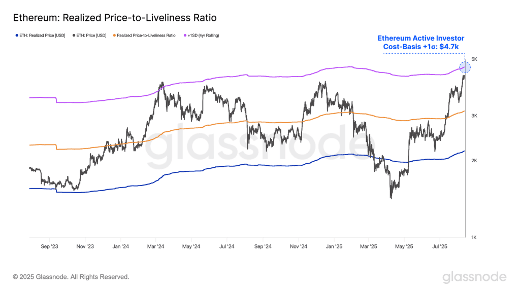 برای ارزیابی اهداف بعدی قیمت اتریوم، می‌توانیم از شاخص قیمت تحقق‌یافته فعال (Active Realized Price) کمک بگیریم. سطح انحراف معیار ۱+ این شاخص، یکی از اهداف اصلی قیمت اتریوم است و معمولا در این سطح، فشار فروش اتریوم به‌شدت افزایش می‌یابد. در حال حاضر، این سطح برابر با قیمت ۴,۷۰۰ دلار است و می‌توان این سطح را به‌عنوان محدوده هیجانی یا اشباع بازار اتریوم در نظر گرفت.