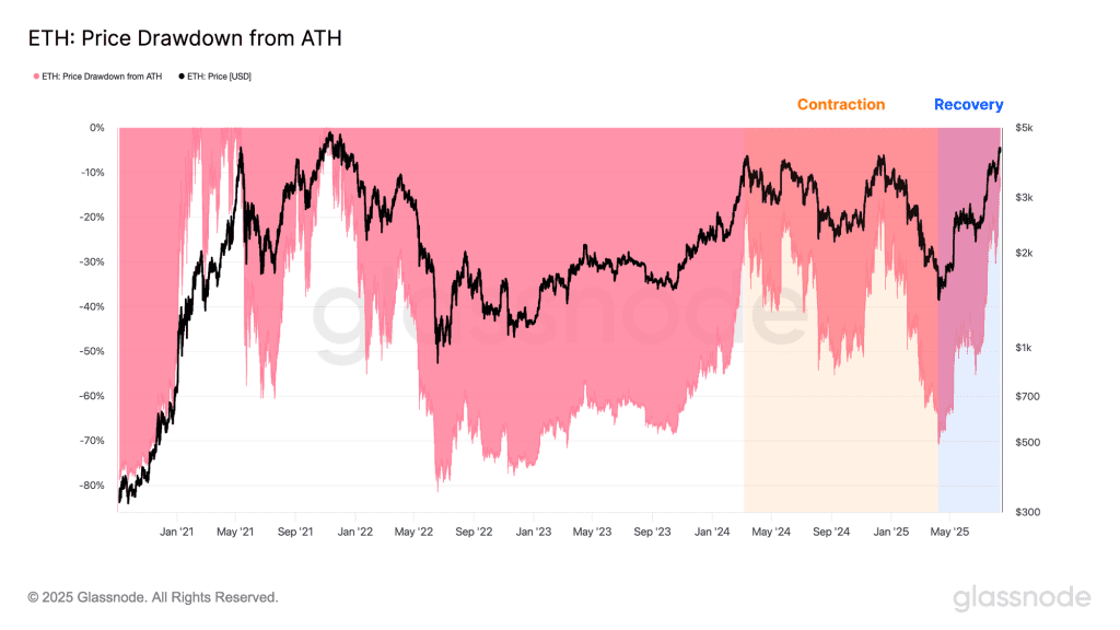 سطح انحراف معیار ۱+ در شاخص قیمت تحقق‌یافته فعال از نظر تاریخی نیز بسیار مهم است. در چرخه صعودی ۲۰۲۰ – ۲۰۲۱، این سطح چندین بار به‌عنوان یک مقاومت قدرتمند عمل کرد و در رالی مارس ۲۰۲۴ نیز این محدوده سقف اتریوم بود. تقریبا هر زمان که قیمت اتریوم از این سطح بالاتر رفته است، هیجانات سرمایه‌گذاران به‌شدت افزایش یافته و بازار ساختار شکننده یا آسیب‌پذیر پیدا کرده است.