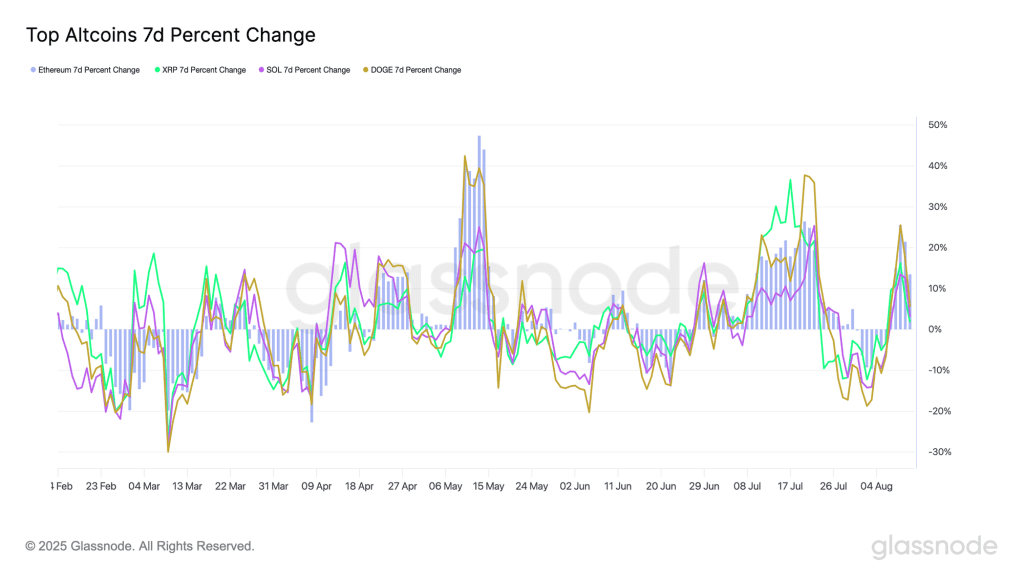 اگر تغییرات درصدی ۷روزه آلت کوین‌های برتر، یعنی اتریوم (ETH)، ریپل (XRP)، سولانا (SOL) و دوج کوین (DOGE) را بررسی کنیم، متوجه می‌شویم که این آلت کوین‌ها در دو ماه اخیر (جولای و آگوست) به‌ طور قابل‌توجهی رشد کرده‌اند: