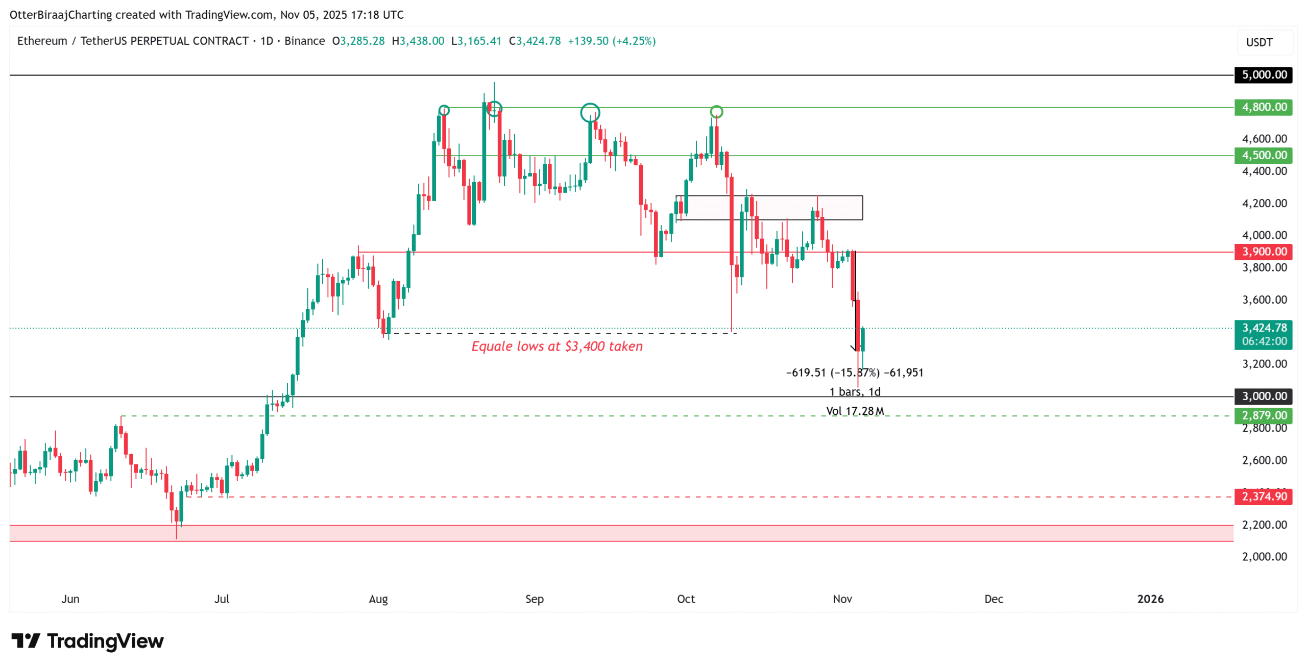 به گزارش کوین تلگراف، قیمت اتریوم در روز سهشنبه با سقوط به ۳٬۰۵۵ دلار بیش از ۱۳ درصد در هفته افت کرد. این حرکت، نقدینگی انباشتهشده در محدوده کفهای مساوی نزدیک ۳٬۴۰۰ دلار را تخلیه کرد. اکنون مهمترین ناحیه نقدینگی بین ۳٬۰۰۰ تا ۲٬۸۰۰ دلار قرار دارد که پیشتر نیز بهعنوان حمایت بلندمدت عمل کرده بود.