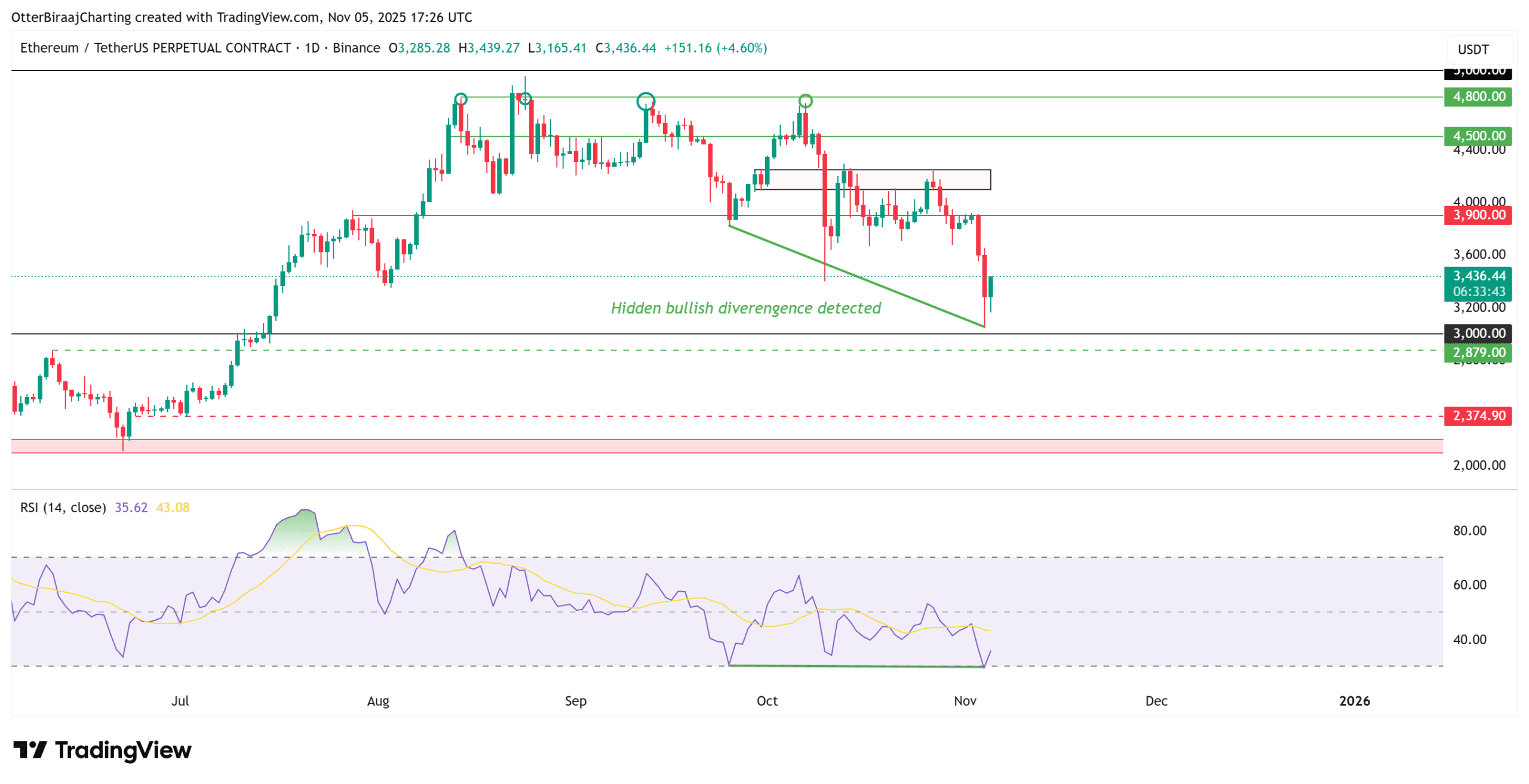 به این مورد باید افزود که در نمودار روزانه ETH، یک واگرایی صعودی پنهان بین قیمت و شاخص قدرت نسبی (RSI) دیده میشود. جایی که قیمت کفهای پایینتر ولی RSI کفهای مساوی تشکیل داده است. نشانهای که معمولاً از تغییر روند و احتمال بازگشت قیمت خبر میدهد. با این حال، معاملهگر معروف «Daan Trades» هشدار داد: