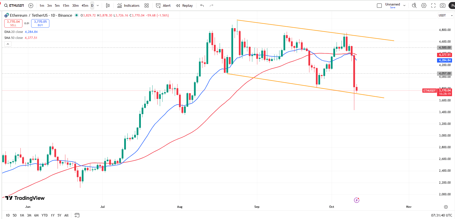 انتشار خبر مربوط به تعرفه‌های ۱۰۰ درصدی آمریکا روی کالاهای چینی هم باعث شد قیمت اتریوم تا ۳٬۳۰۰ دلار سقوط کند. انتظار می‌رود خریداران از محدوده حمایتی ۳٬۷۴۵ دلار با تمام توان دفاع کنند، زیرا از دست دادن‌ این ناحیه می‌تواند نشانه‌ای از تشکیل سقف کوتاه‌مدت باشد. در چنین حالتی، ارز ETH ممکن است روند نزولی جدیدی را تا محدوده ۳٬۳۵۰ دلار آغاز کند.