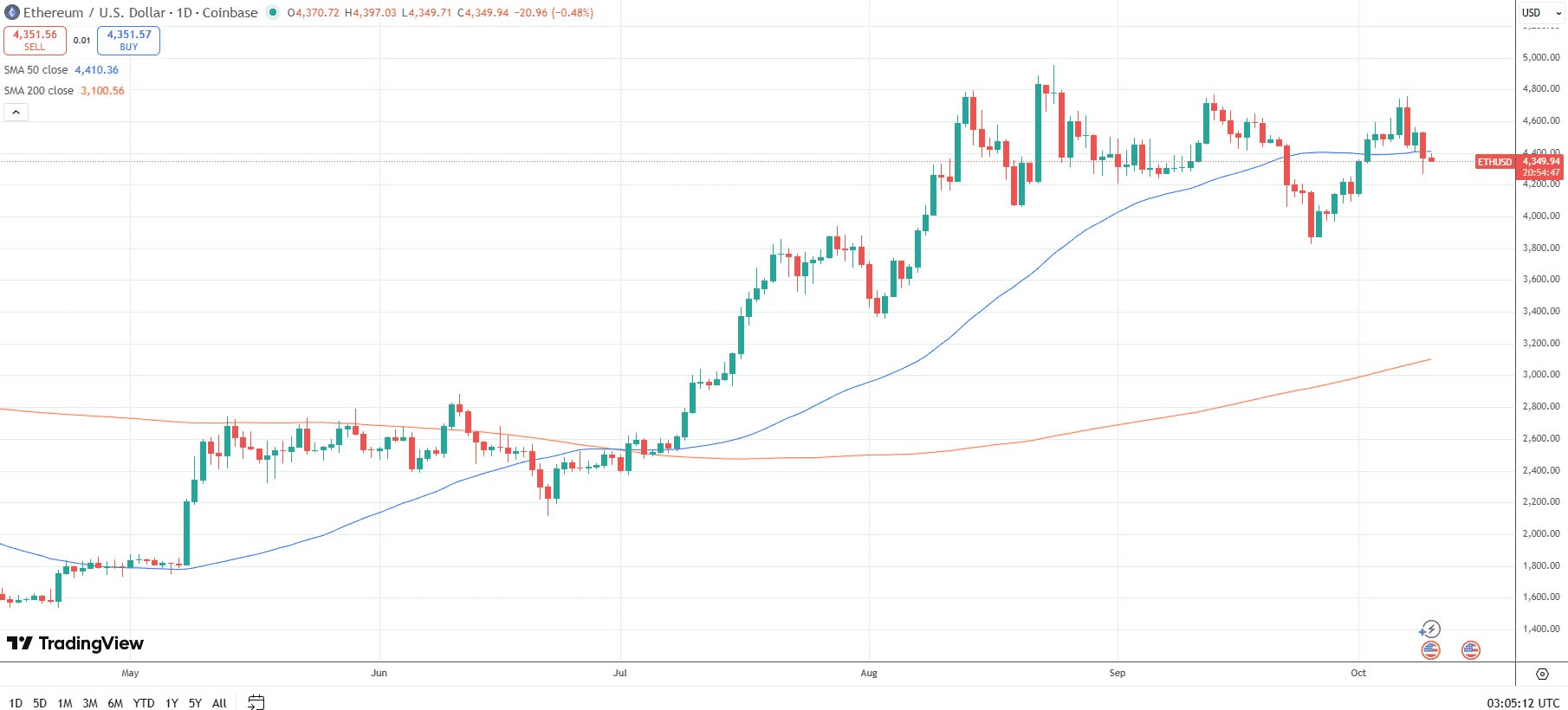 اتریوم روز سه‌شنبه به اوج هفتگی ۴٬۷۵۰ دلار رسید، اما از آن زمان تضعیف شد‌ه‌ و در معاملات اواخر روز پنجشنبه برای مدت کوتاهی به زیر ۴٬۳۰۰ دلار سقوط کرد. این دارایی در معاملات اولیه صبح جمعه نزدیک به ۴٬۴۰۰ دلار بازگشت، اما همچنان در کانالی که در اوایل ماه آگوست (مرداد) و با عبور از ۴٬۰۰۰ دلار شکل گرفته بود، در نوسان است.