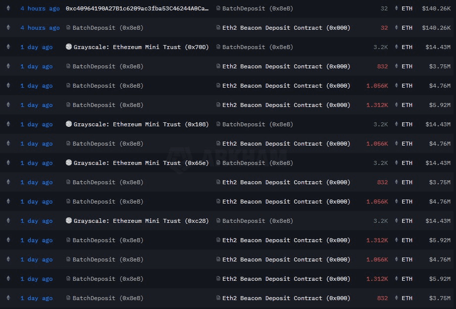 طبق داده‌های آرکهام اینتلیجنس، گری‌اسکیل در چند روز گذشته برای ETH استیکینگ جدید خود، اقدام به جمع‌آوری و استیک ETH به ارزش صدها میلیون دلار کرده است.