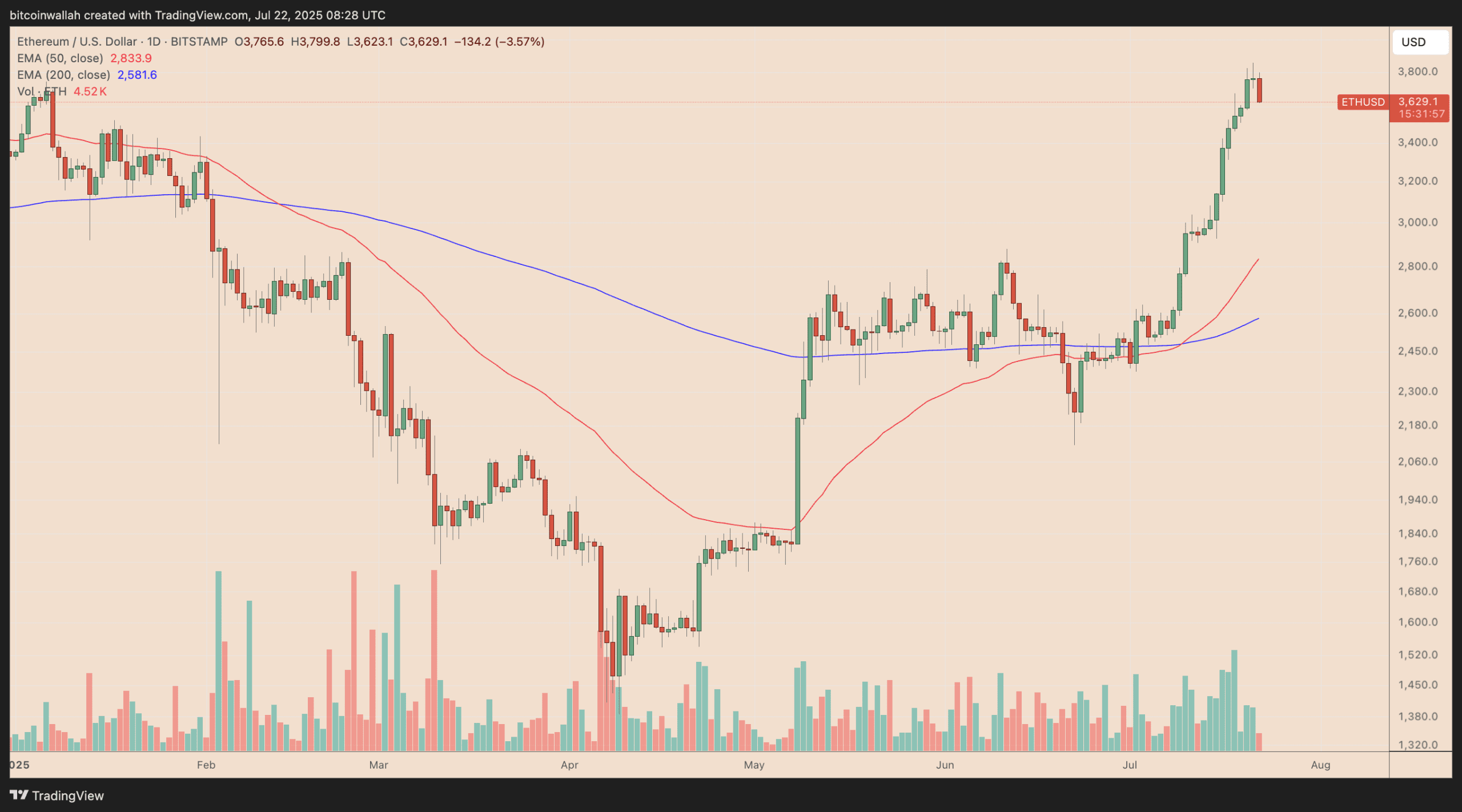اگر این روند ادامه پیدا کند، قیمت ممکن است تا ماه آینده به محدوده ۳٬۰۰۰ تا ۳٬۲۰۰ دلار بازگردد. این محدوده با میانگین متحرک نمایی ۲۰ روزه (موج بنفش، ۳٬۱۸۷ دلار) هم‌راستا است و به عنوان سطح حمایتی کلیدی شناخته می‌شود.
