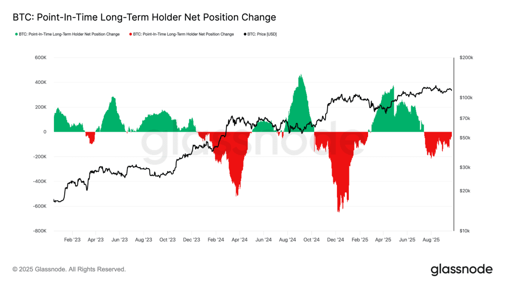 تا الان یک تعادل نسبی بین فروش هولدرهای بلندمدت و سرمایه ورودی به ETFها برقرار بود. در زمان جلسه FOMC نرخ فروش از سمت هولدرهای بلندمدت به ۱۲۲,۰۰۰ بیت کوین در ماه رسید، اما سرمایه ورودی به ETFهای بیت کوین (میانگین متحرک ۷روزه) بهشدت کاهش یافته و از ۲,۶۰۰ بیت کوین در روز به نزدیک صفر رسیده است. افزایش فشار فروش از سمت هولدرهای بلندمدت و کاهش تقاضا در ETFها باعث شده است که بازار بیت کوین ضعیف و شکننده شود.