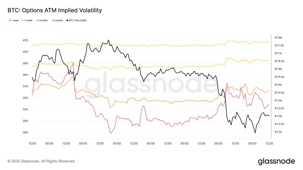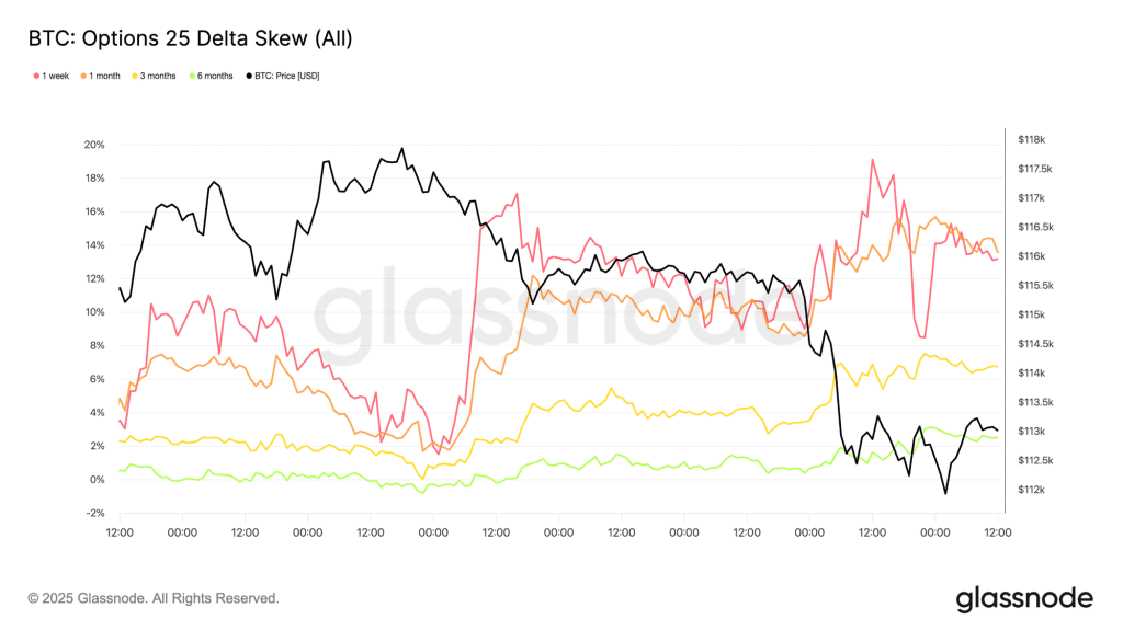 پس از جلسه FOMC، شاخص انحراف دلتای بازار آپشن دوباره به تعادل نسبی رسید؛ البته پریمیوم یا هزینه قراردادهای Put (فروش) نسبت به قراردادهای Call (خرید) کمی بیشتر بود. این تعادل پایدار نبود و در مدت کوتاهی به هم خورد. در روز جمعه، شاخص انحراف دلتای یکهفتهای بازار آپشن بیت کوین بهصورت جهشی از ۱.۵٪ به ۱۷٪ افزایش یافت؛ بهطوری که سررسیدهای بلندمدت را نیز تحتتاثیر قرارداد.