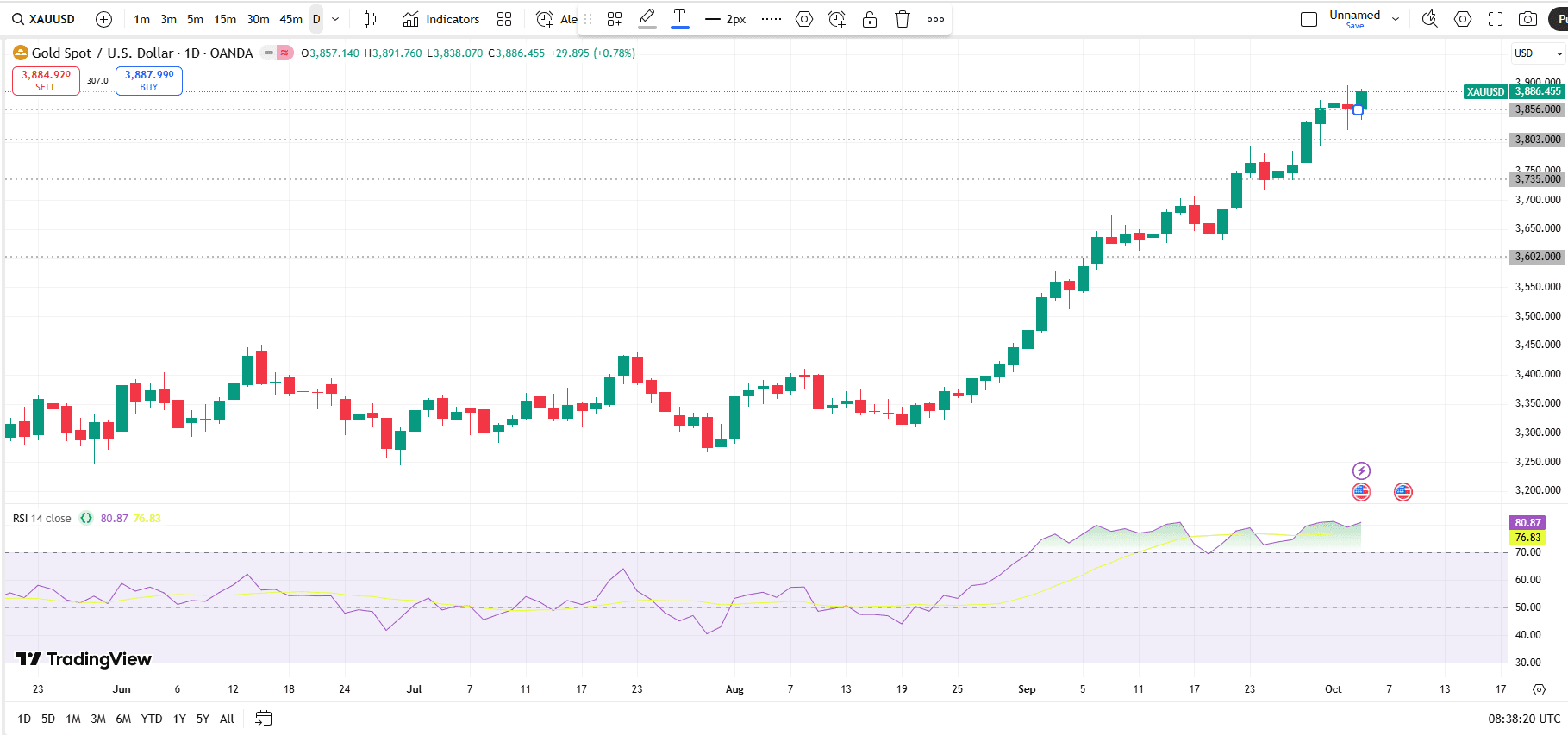 در نمودار چهارساعته، با وجود کاهش اخیر، RSI همچنان بالاتر از خط میانی قرار دارد. این شاخص نشان میدهد که هرگونه افت طلا میتواند به سرعت با خرید مواجه شود. خریداران باید قیمت را بالای سطح ۳٬۹۰۰ دلار در تایمفریم روزانه یا هفتگی تثبیت کنند تا روند صعودی از سر گرفته شود. مقاومت بعدی در ۳٬۹۵۰ دلار قرار دارد و در صورت عبور از آن، هدف بعدی محدوده ۴٬۰۰۰ دلار خواهد بود.