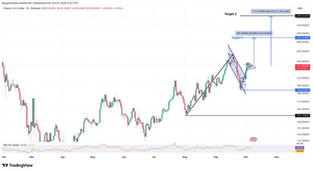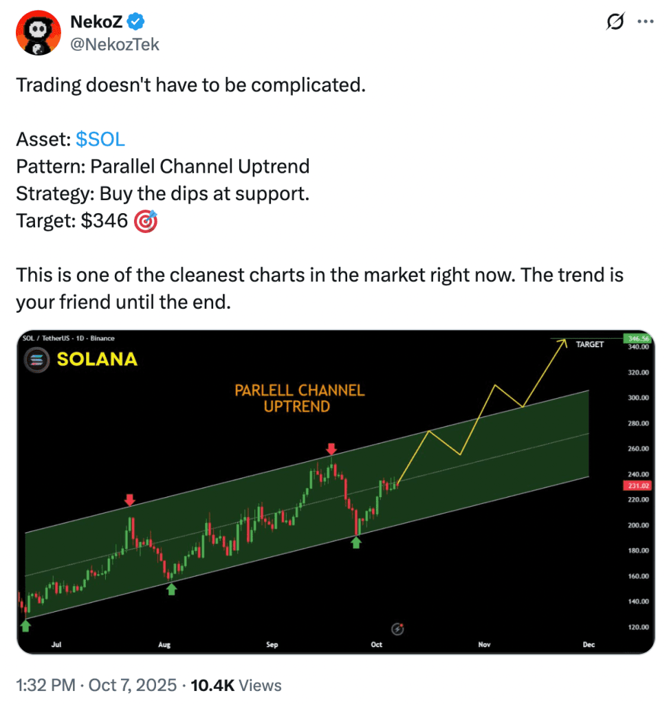 الگوی دوم، بزرگتر است و از اوایل ماه آگوست (مرداد) در حال شکلگیری است. سولانا در روز چهارشنبه از مرز بالایی این الگو در حدود ۲۱۲ دلار عبور کرد. تا زمانی که شکست معتبر باقی بماند، احتمال ادامه روند صعودی تا هدف ۳۴۵ دلار وجود دارد؛ این یعنی حدود ۵۰ درصد رشد از قیمت فعلی. تحلیلگر تکینکال با نام مستعار NekoZ نیز در بررسی خود با استفاده از کانال صعودی موازی، هدف قیمتی مشابهی در حدود ۳۴۶ دلار برای سولانا تعیین کرده است.