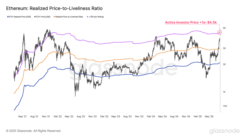 برای شناسایی اهداف بالاتر ETH میتوانیم به باند انحراف معیار ۱+ شاخص قیمت تحققیافته فعال نگاه کنیم. این سطح در واقع آستانه بالای قیمت ETH محسوب میشود و احتمال دارد که فشار فروش در این نقطه شدت بگیرد. در حال حاضر، سطح انحراف معیار ۱+ شاخص قیمت تحققیافته فعال برابر با ۴,۵۰۰ دلار است. با توجه به شرایط فعلی بازار، باید این محدوده را بهعنوان منطقه اشباع اتریوم در نظر بگیریم.