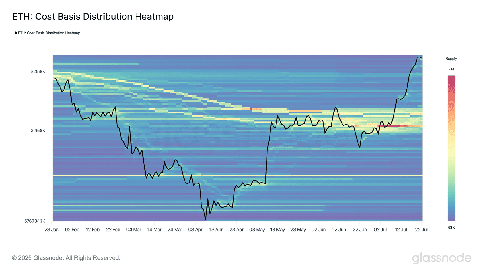 به گزارش گلسنود، بررسی شاخص توزیع هزینه یا قیمت خرید اتریوم (Cost-Basis Distribution) نشان میدهد که حجم قابلتوجهی از سرمایه در محدوده ۲,۴۰۰ تا ۲,۸۰۰ دلار متراکم شده است (خرید زیادی در این محدوده انجام شده است). در حال حاضر قیمت اتریوم بسیار بالاتر از این سطوح است و در محدودهای معامله میشود که تراکم عرضه در آن کم است (خرید کمی در آن انجام شده است).