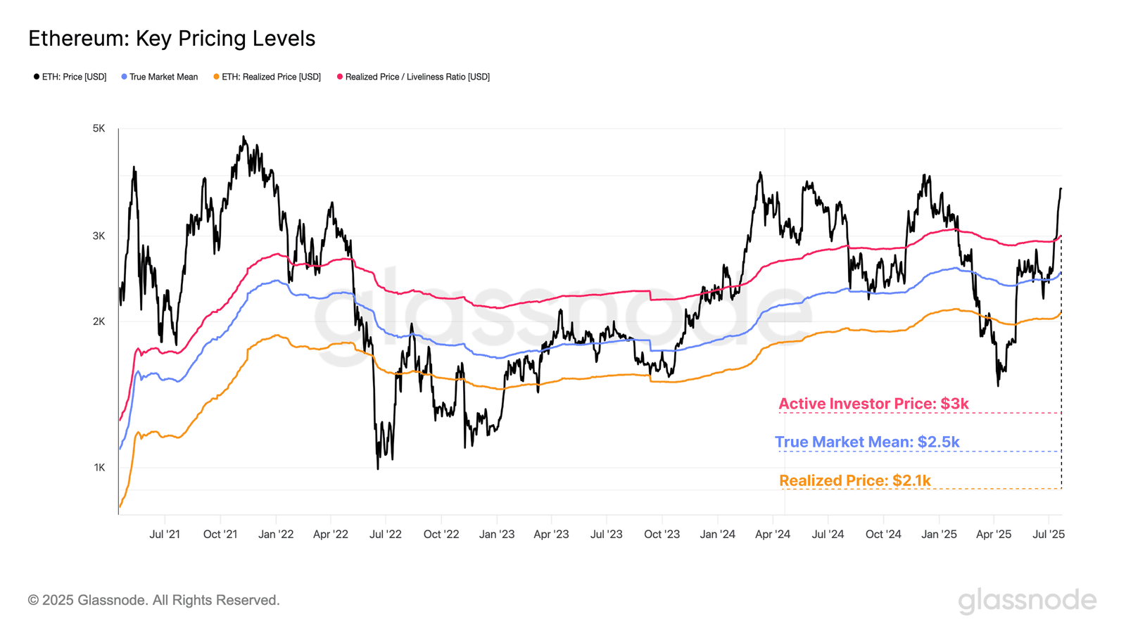 دادههای بهدستآمده از شاخصهای مختلف شبکه اتریوم این ادعا را تایید میکند. از جمله این شاخصها، ۲ شاخص مهم میانگین حقیقی بازار (True Market Mean) و قیمت تحققیافته فعال (Active Realized Price) هستند که بر مبنی قیمت خرید سرمایهگذاران تنظیم شدهاند و کوینهای غیرفعال یا دست نخورده و از دست رفته را در نظر نمیگیرند.