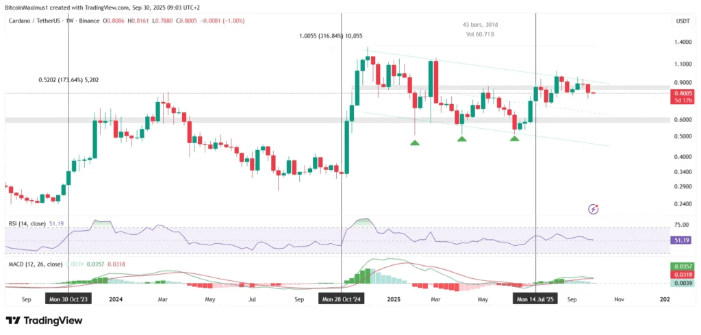 به گزارش سیسیان، قیمت ADA طی ۳۰۰ روز گذشته در یک کانال نزولی موازی قرار داشته است؛ این روند از دسامبر ۲۰۲۴ و رسیدن به اوج چرخه آن در ۱.۳۲ دلار آغاز شد.