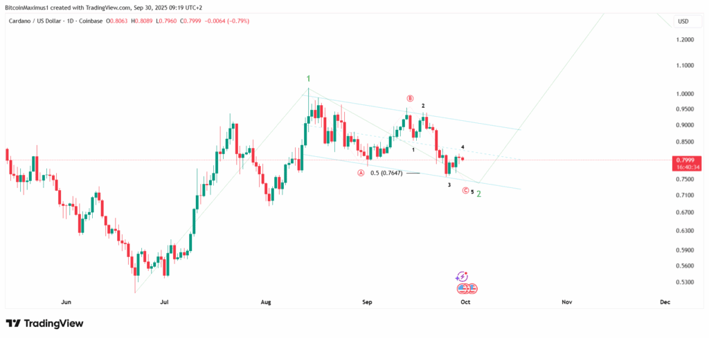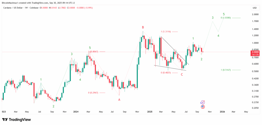 بر اساس شمارش موجها، کاردانو اصلاح طولانی A-B-C (قرمز) خود را کامل کرده و از ژوئن وارد حرکت صعودی پنجموجی جدید (سبز) شده است. در حال حاضر، موج سوم این چرخه آغاز شده که میتواند قیمت را تا اوج ۱.۸۴ دلار برساند. این هدف با مقایسه طول موج فعلی با موج قبلی تعیین شده است.