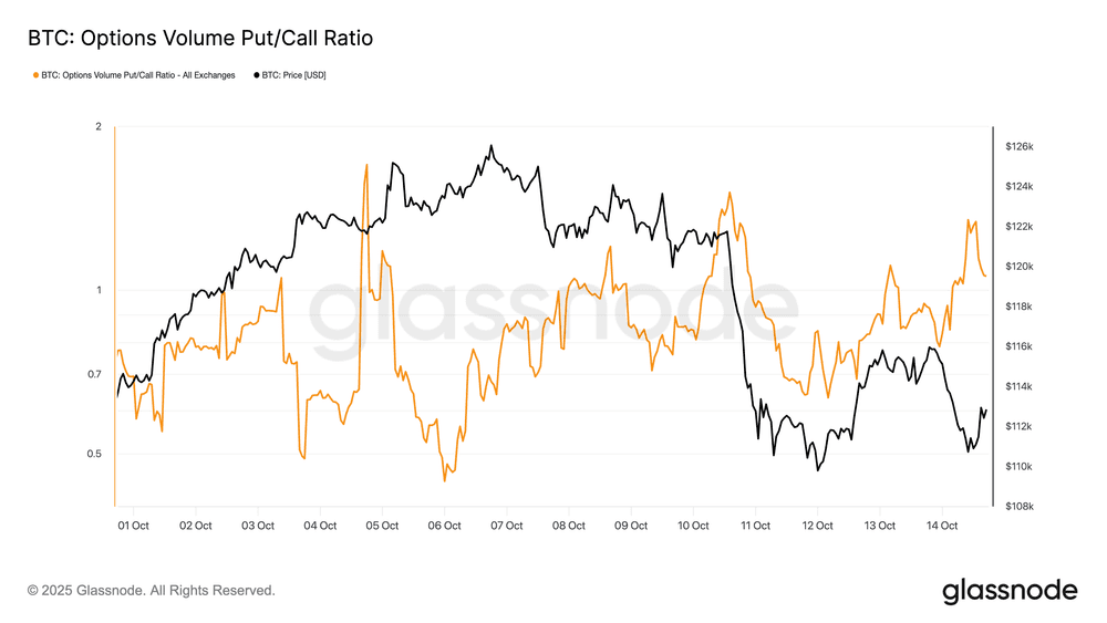 در اوایل هفته گذشته، عدد این شاخص تقریبا ۰.۸ بود. در روز جمعه هفته گذشته که بیت‌ کوین در حوالی ۱۲۱,۷۰۰ دلار معامله می‌شد، این شاخص از سطح ۱.۰ فراتر رفت و به اوج ۱.۵۱ رسید و در نهایت، عدد ۱.۴۱ برای آن روز ثبت شد. افزایش‌های ناگهانی شاخص نسبت حجم معاملات پوت/کال اغلب (نه همیشه) نشانه تنش در ساختار بازار یا پوشش ریسک متمرکز است و نشان می‌دهد که معامله‌گران حتی قبل از آغاز موج لیکوییدیشن، به‌صورت فعال در حال مدیریت ریسک خود بودند.