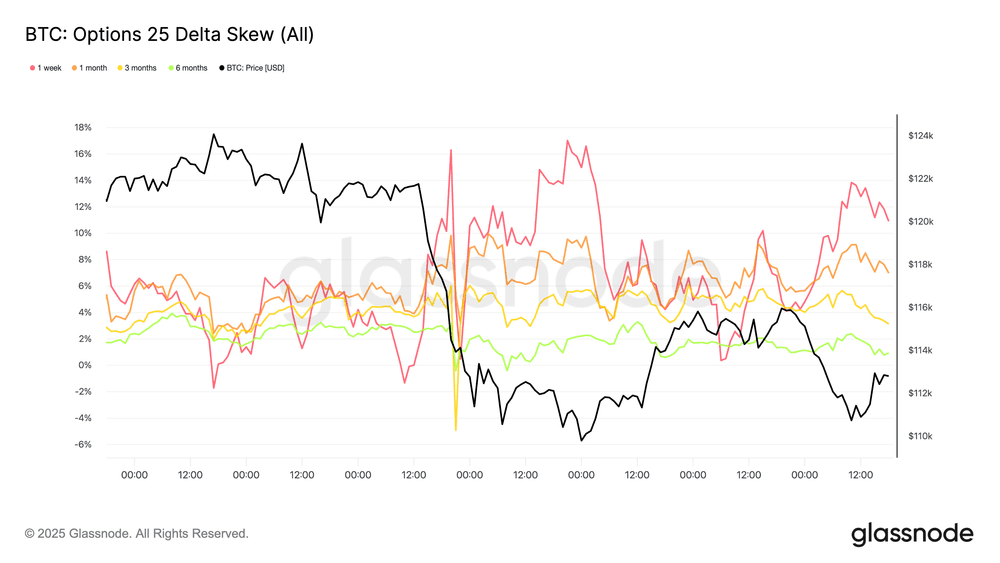 پس از افزایش شدید نوسانات، تمایل معامله‌گران به پوشش ریسک و حفظ سرمایه در برابر ریزش قیمت بسیار بیشتر شد. پس از بزرگ‌ترین لیکوییدیشن تاریخ بازار آپشن‌ بیت‌ کوین، شاخص انحراف ۲۵ دلتا (که از تفاضل قیمت پوت‌ها و کال‌ها به‌دست می‌آید) در تمام سررسیدها به شدت افزایش یافت و تقاضا برای پوشش ریسک به اوج خود رسید.