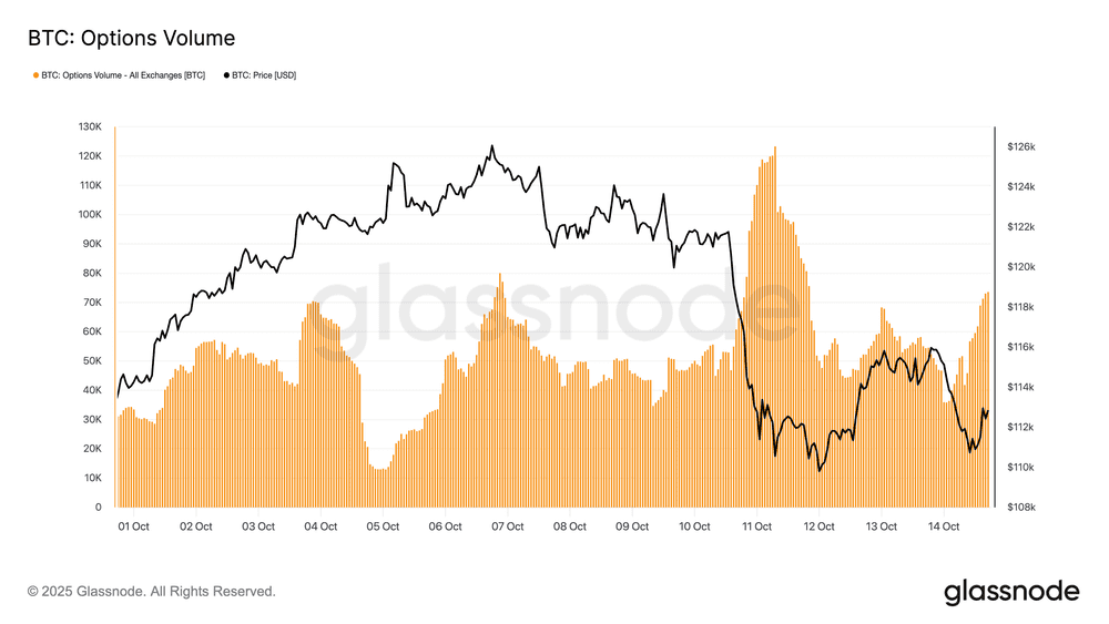 هم‌زمان با افزایش ناگهانی نوسانات و رشد سریع اوپن اینترست بازار آپشن بیت کوین، حجم معاملات این بازار نیز به‌طور قابل توجهی افزایش یافت. پس از سقوط شدید قیمت بیت کوین در روز جمعه هفته گذشته، حجم معاملات آپشن در روز بعد آن، یعنی شنبه، به‌شدت رشد کرد؛ چون معامله‌گران به‌سرعت برای مدیریت ریسک خود وارد عمل شدند. داده‌های بازار آپشن نشان می‌دهد که در طول ریزش قیمت بیت کوین و بلافاصله پس از آن، فعالیت معاملاتی در بازار افزایش یافته است.