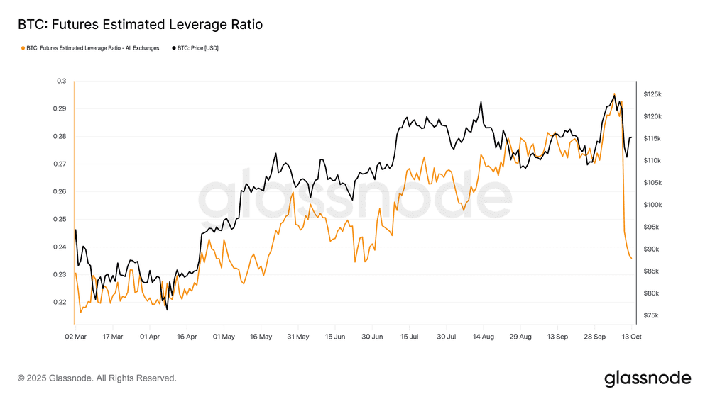 به‌دنبال کاهش شدید اوپن اینترست بازار فیوچرز، شاخص نسبت اهرم تخمینی (Estimated Leverage Ratio) — که نسبت قراردادهای باز به موجودی صرافی‌ها را نشان می‌دهد — نیز به کف چندماهه خود رسید. این رویداد که یکی از بزرگ‌ترین بازتنظیم‌های یک‌روزه در تاریخ بیت کوین بود، اهرم اضافی را از بازار پاک‌سازی کرد.